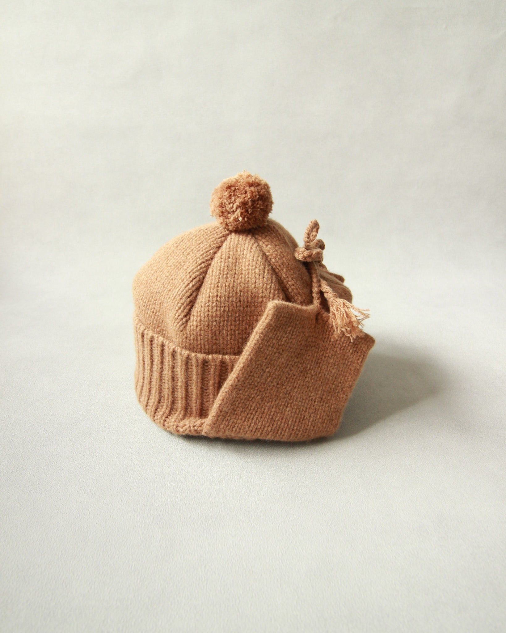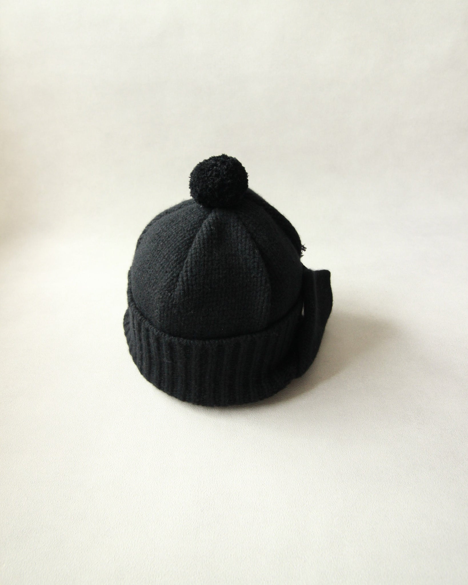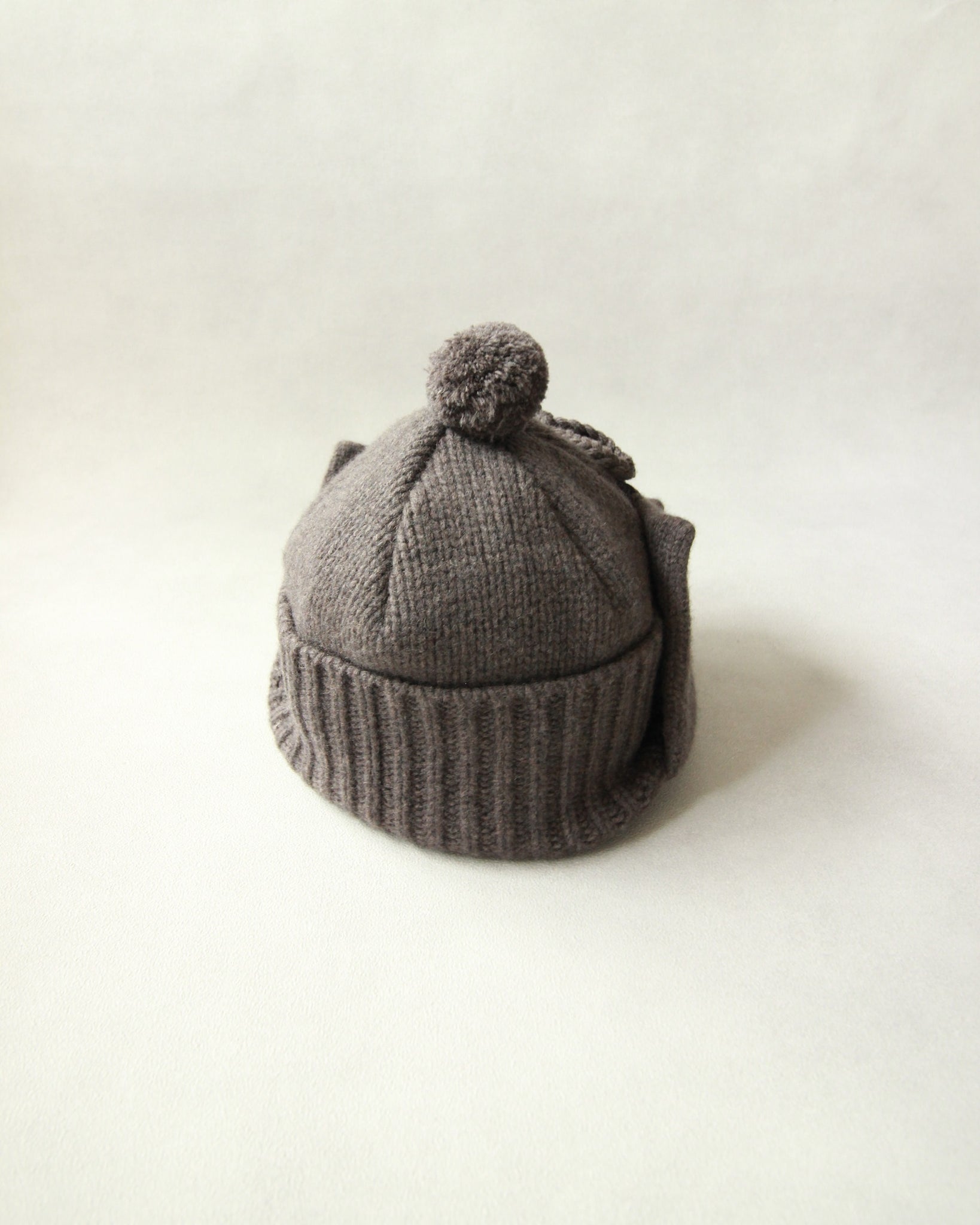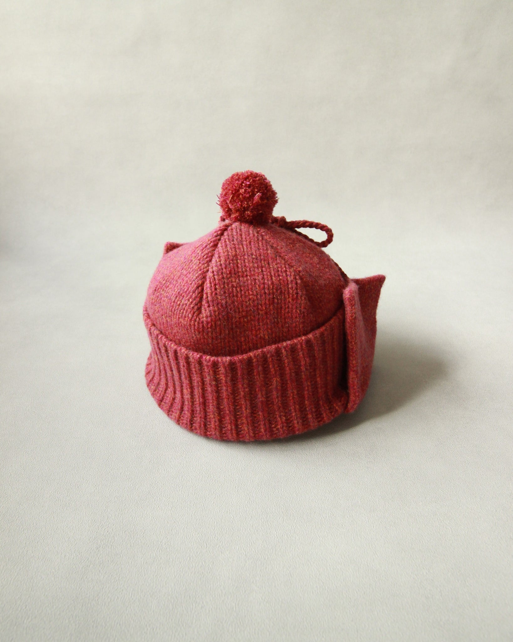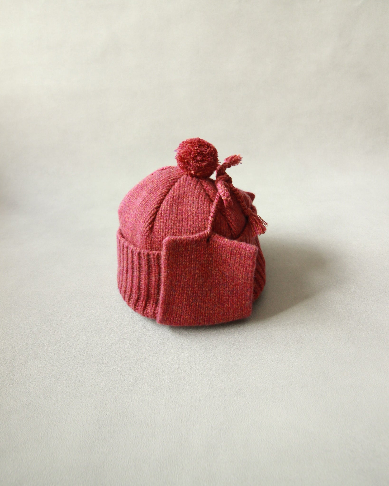 A pom-pom knit hat knitted from extra fine lambswool, which has a soft and fluffy texture.