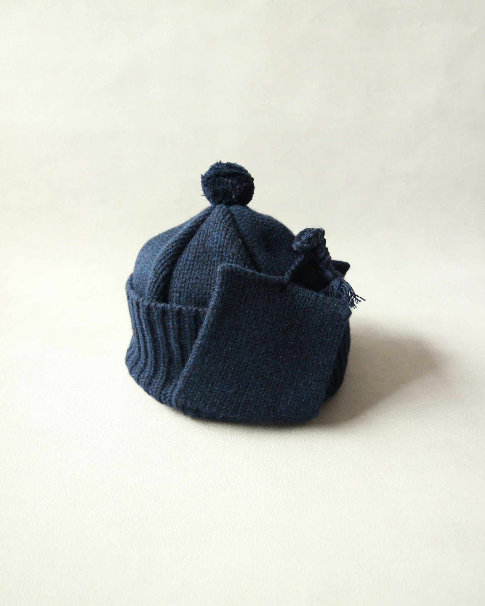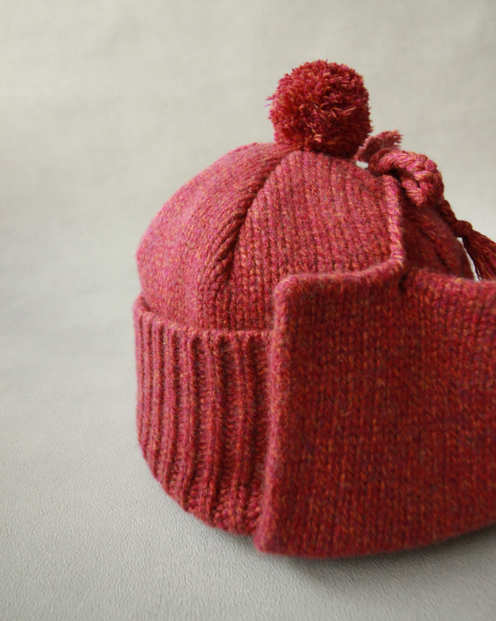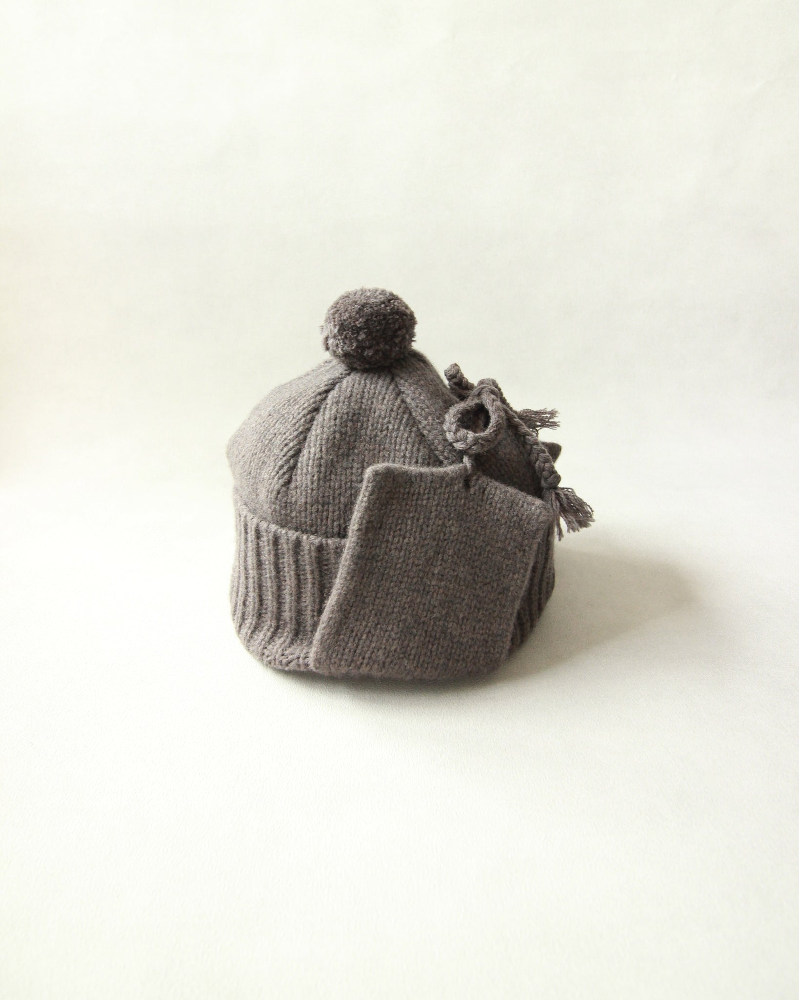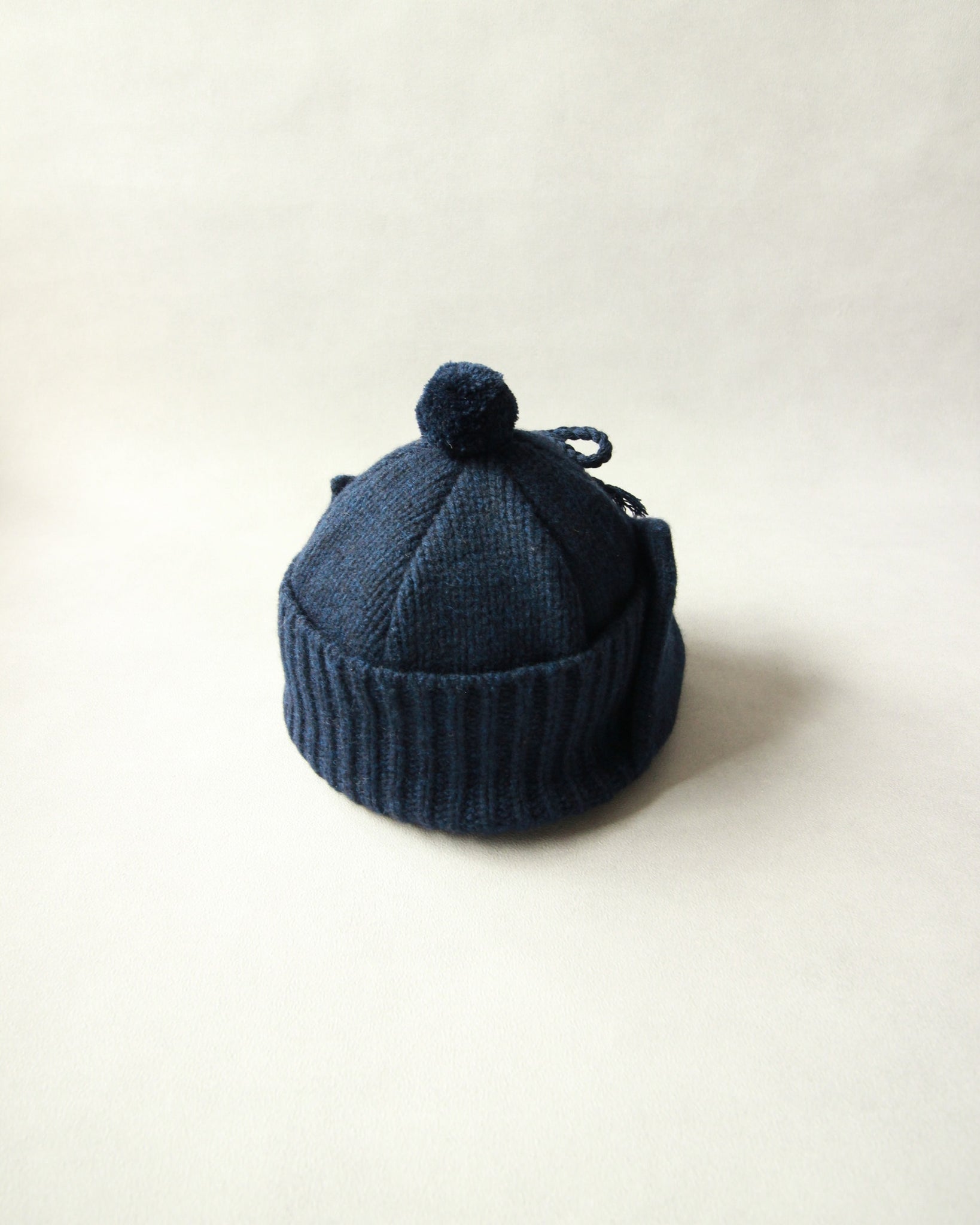 A pom-pom knit hat knitted from extra fine lambswool, which has a soft and fluffy texture.