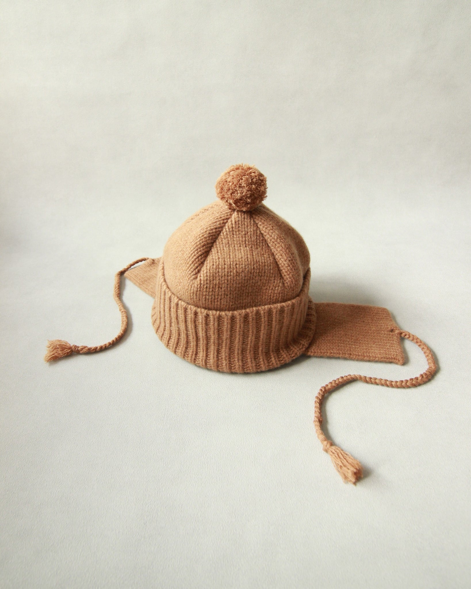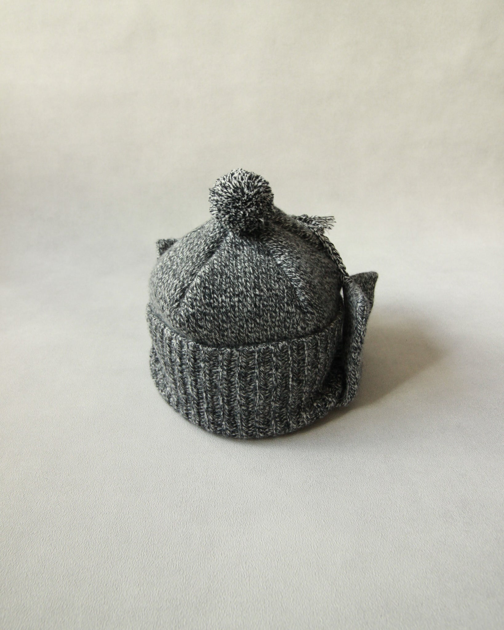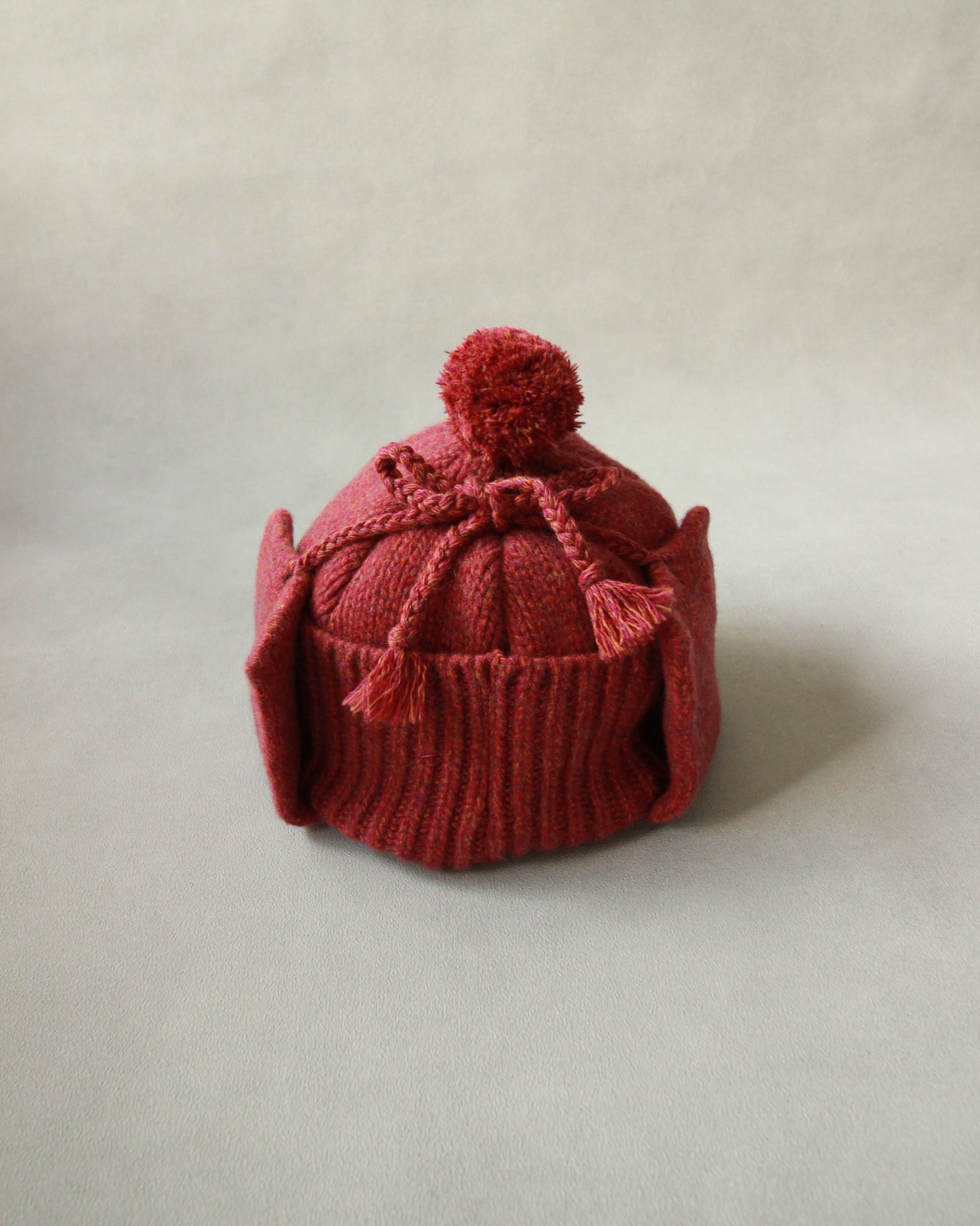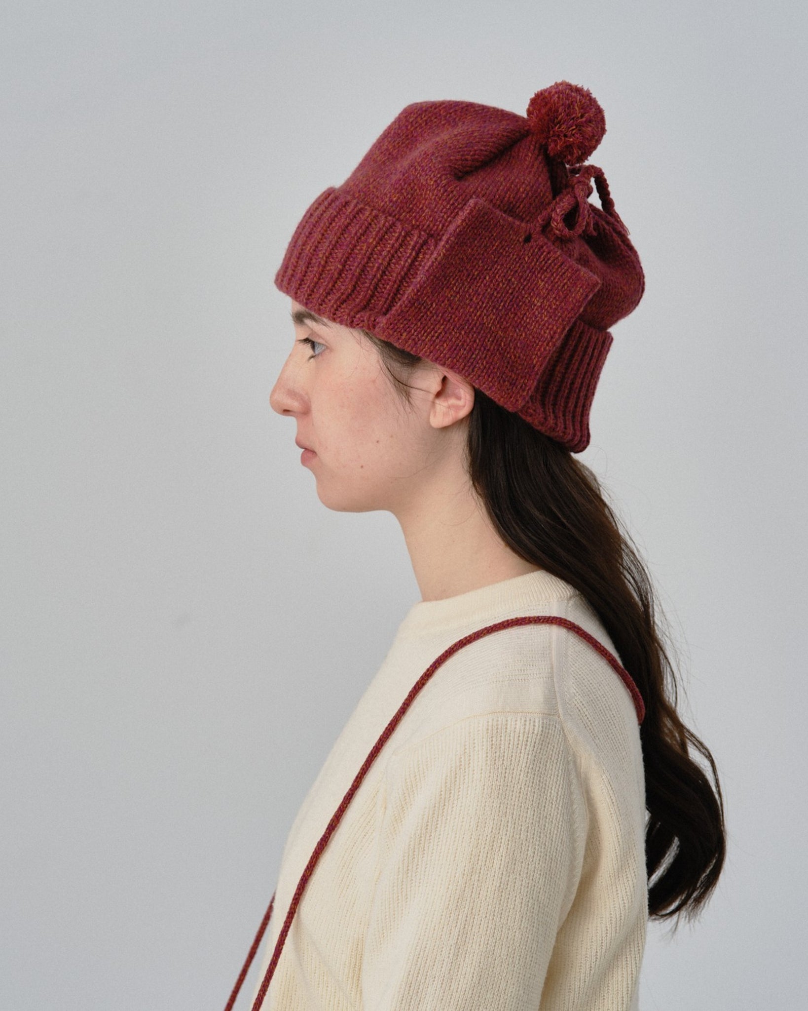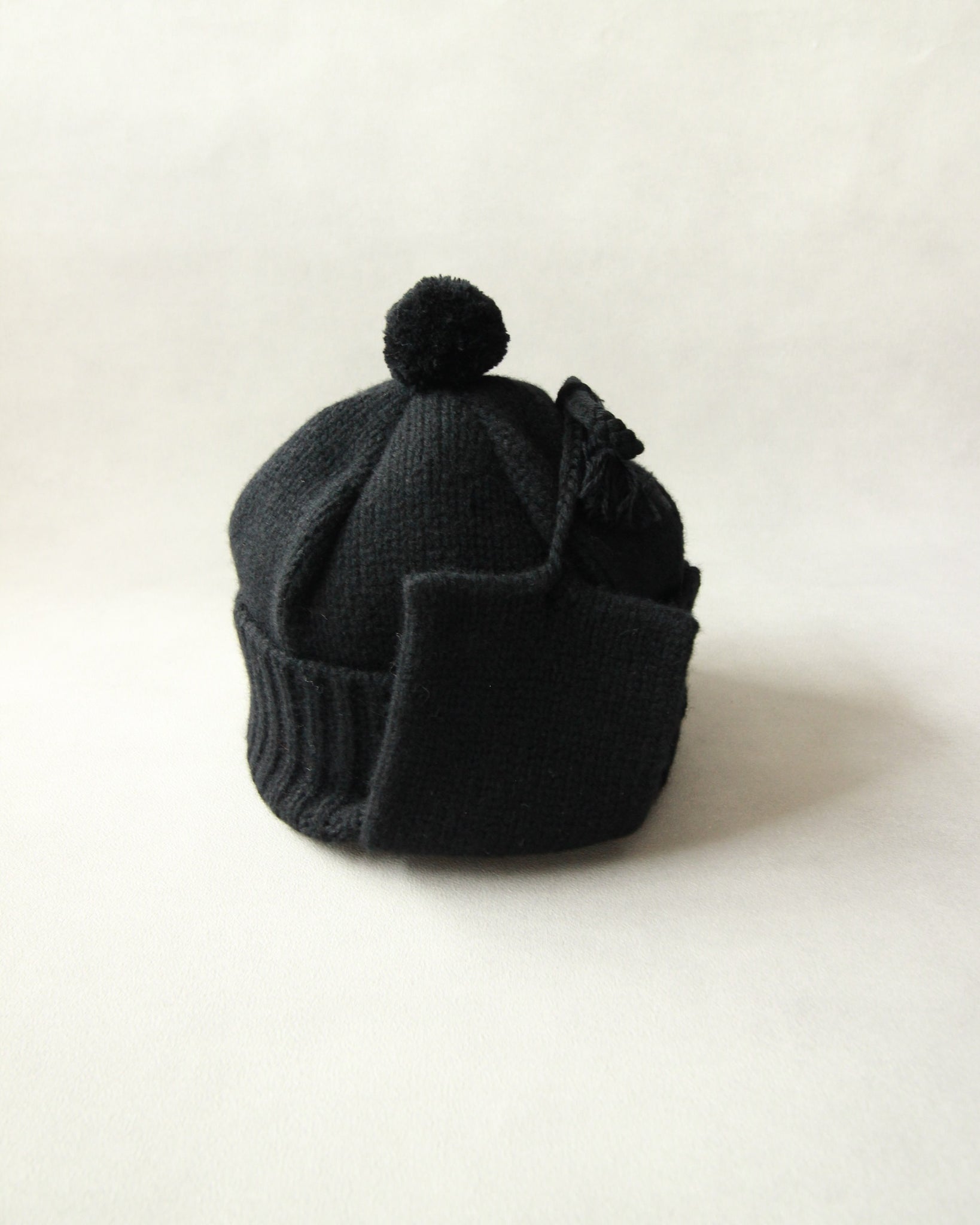 A pom-pom knit hat knitted from extra fine lambswool, which has a soft and fluffy texture.