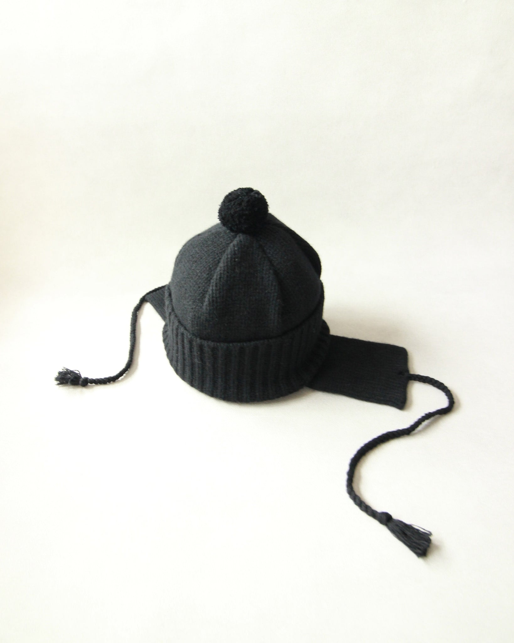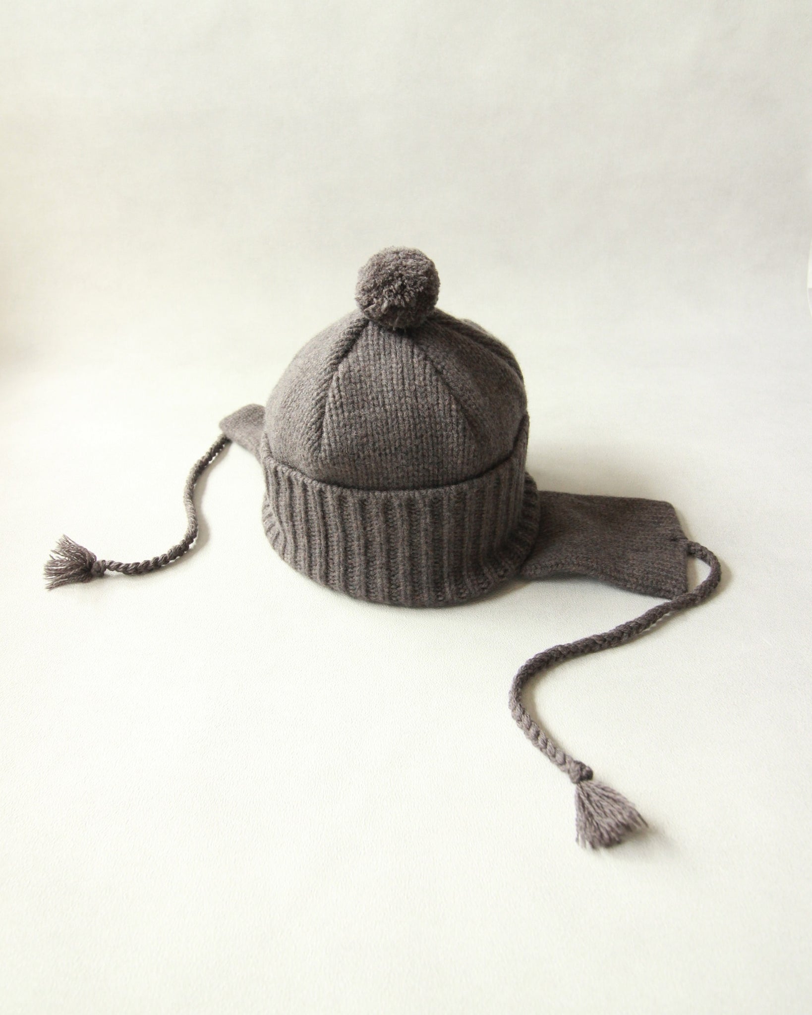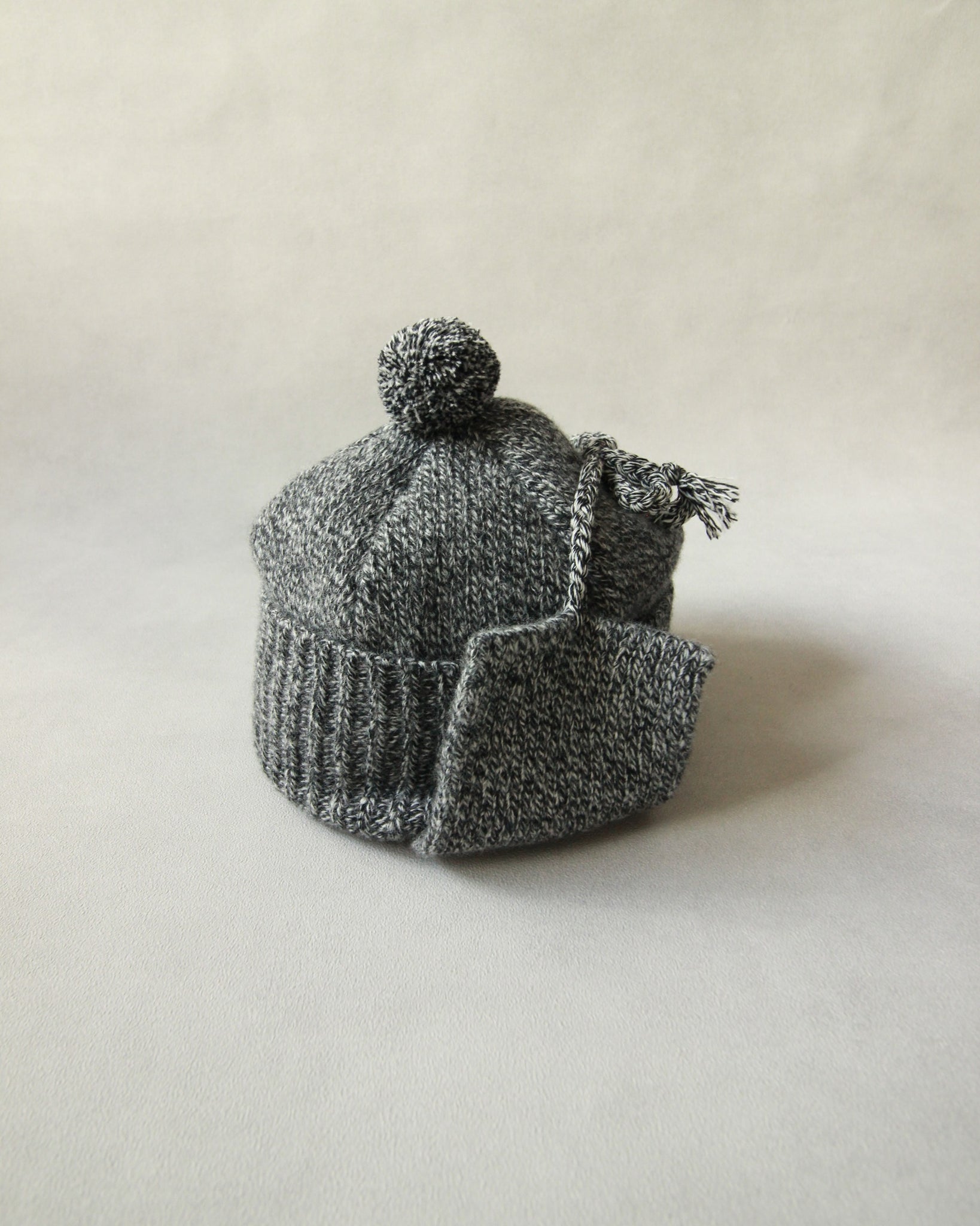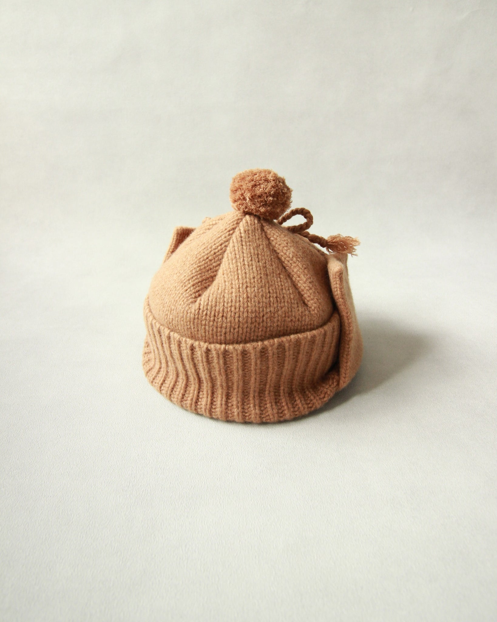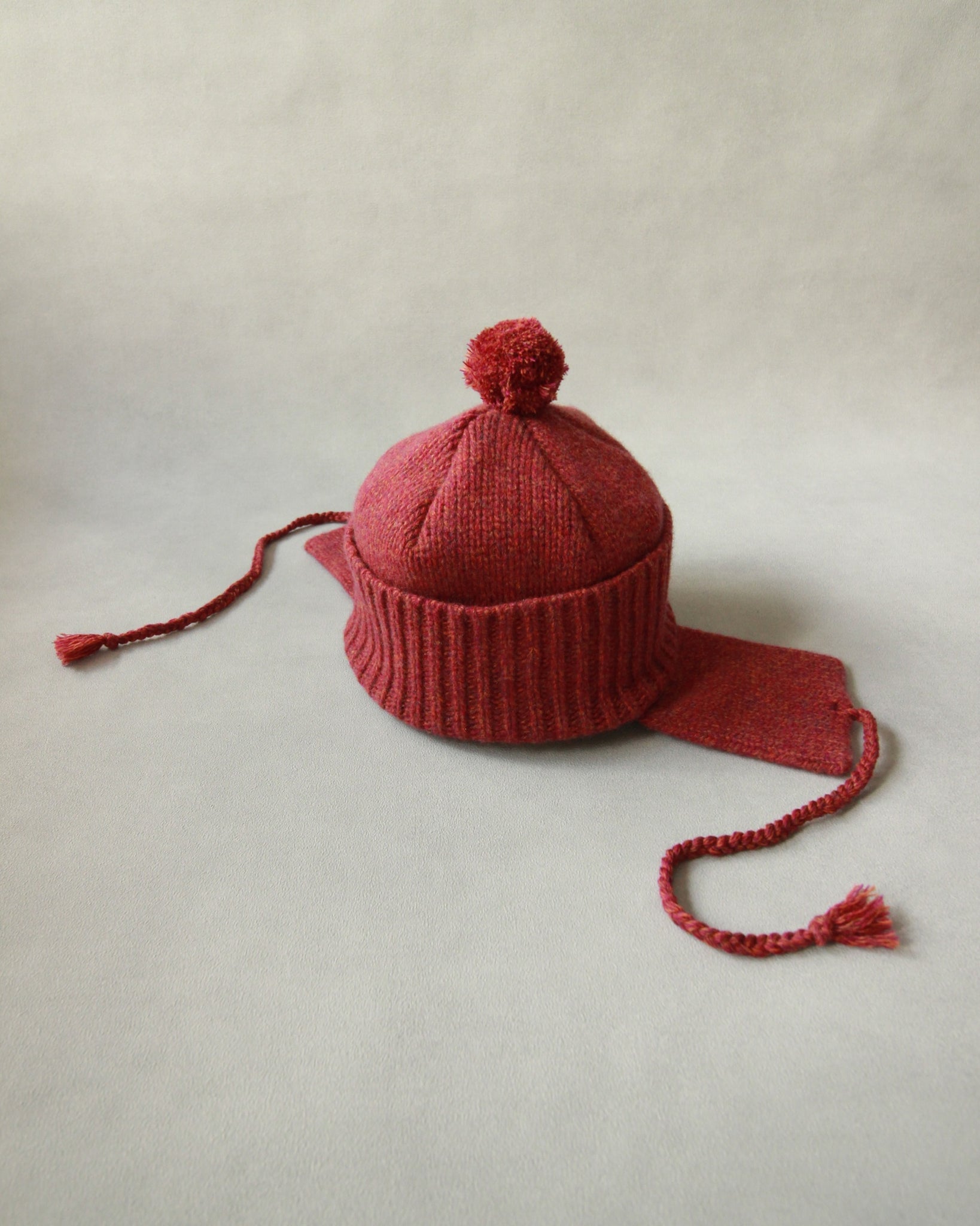 A pom-pom knit hat knitted from extra fine lambswool, which has a soft and fluffy texture.