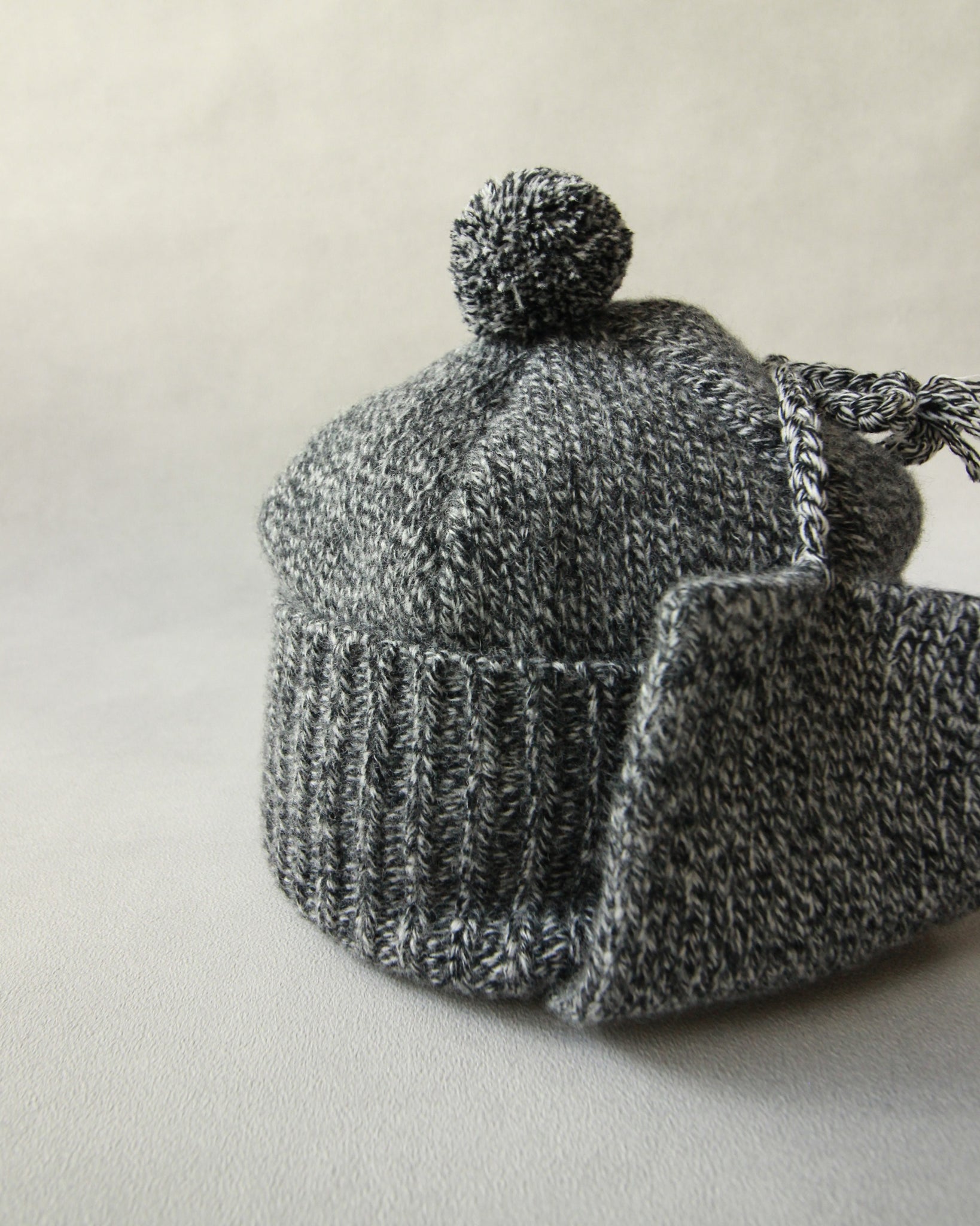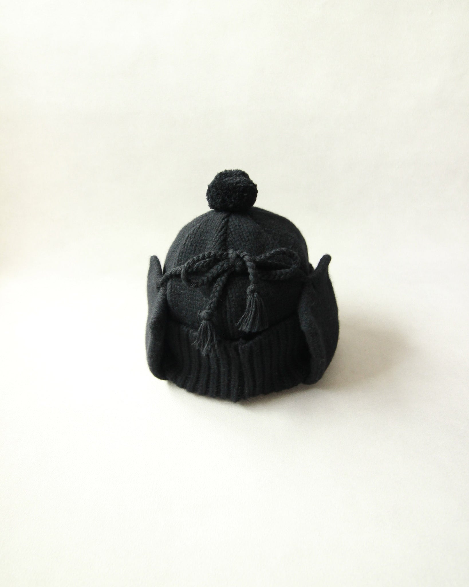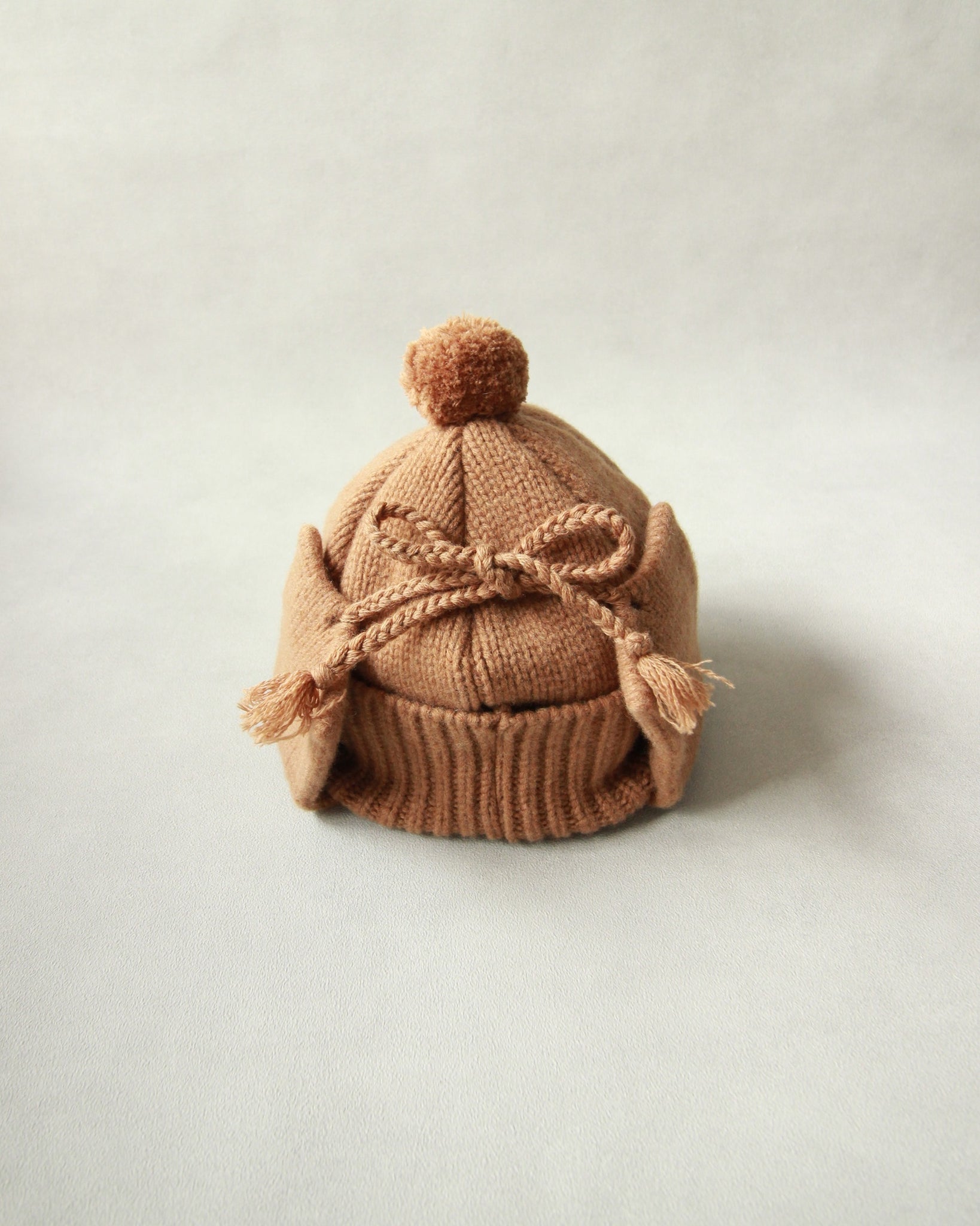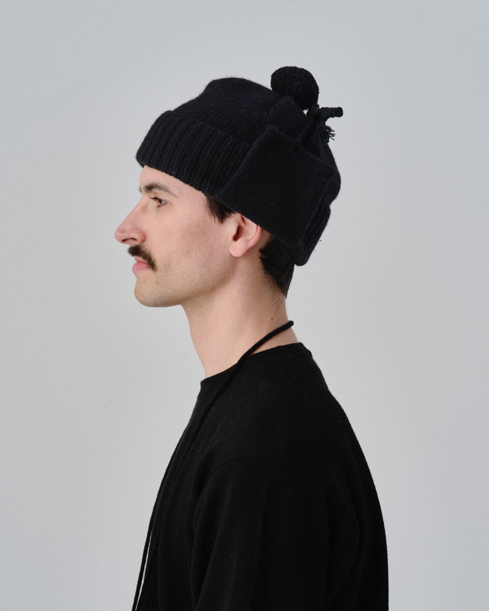 A pom-pom knit hat knitted from extra fine lambswool, which has a soft and fluffy texture.