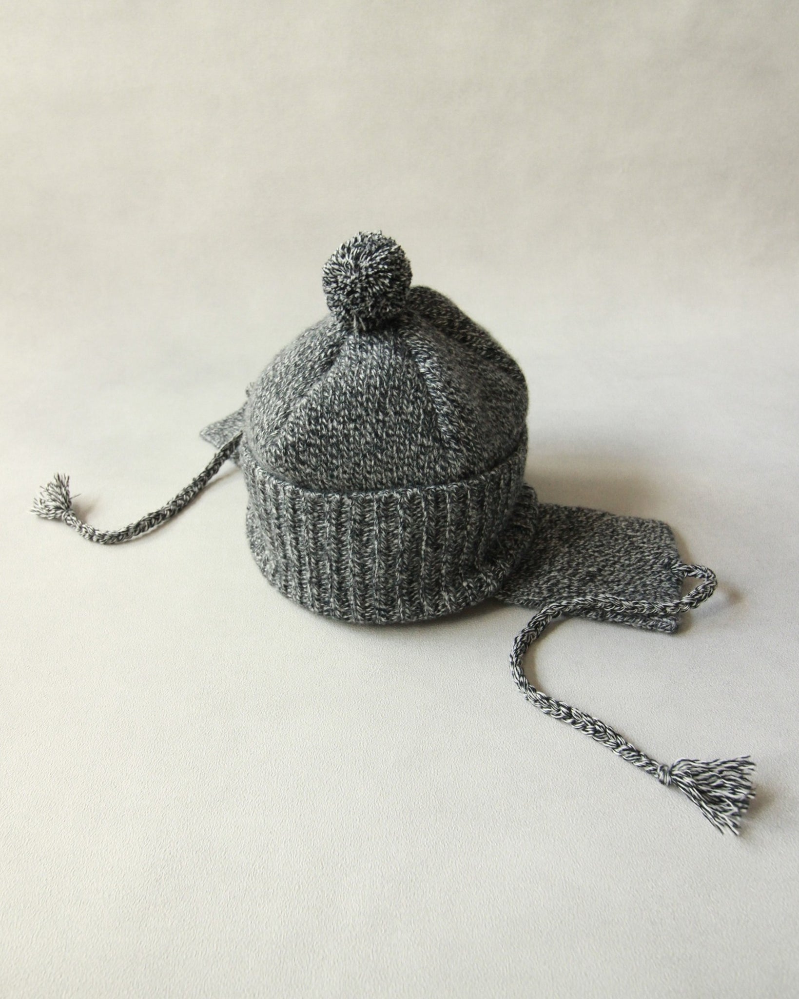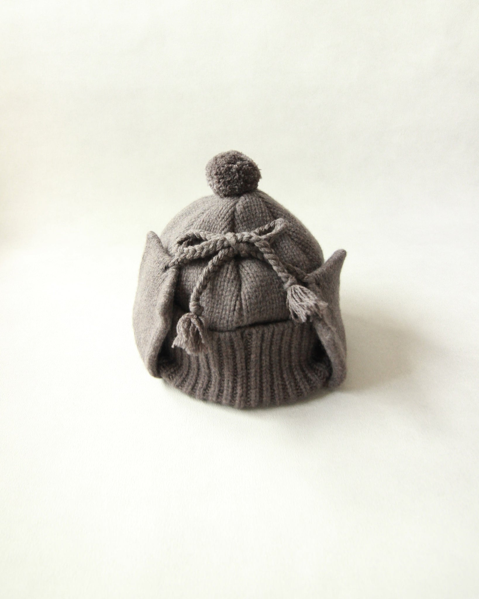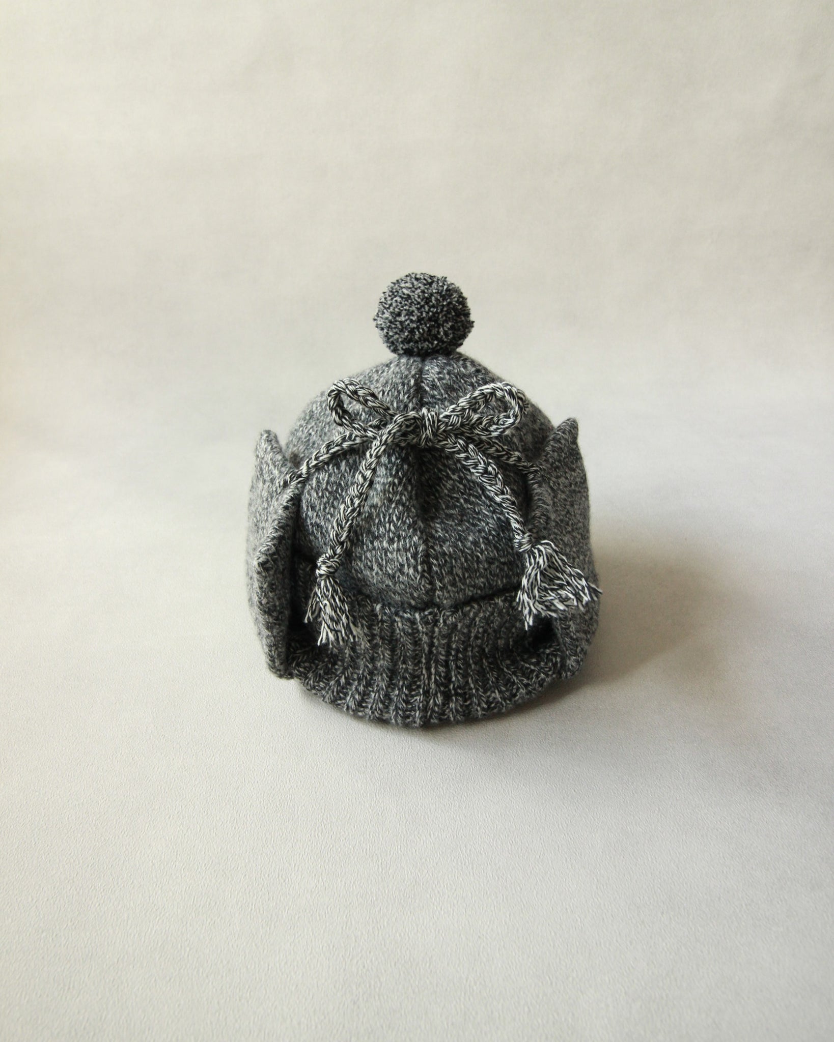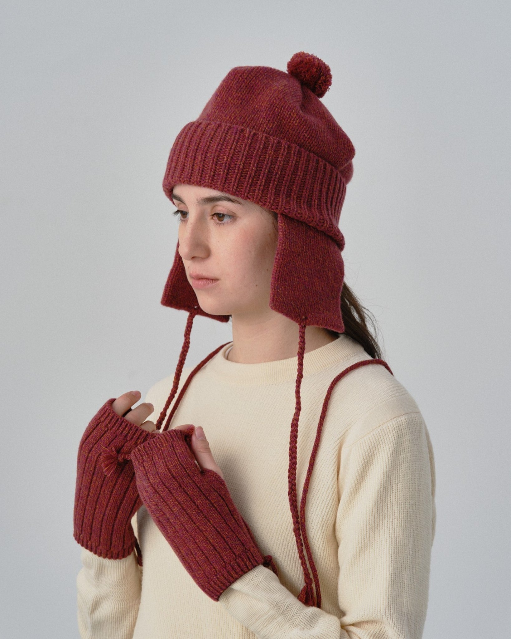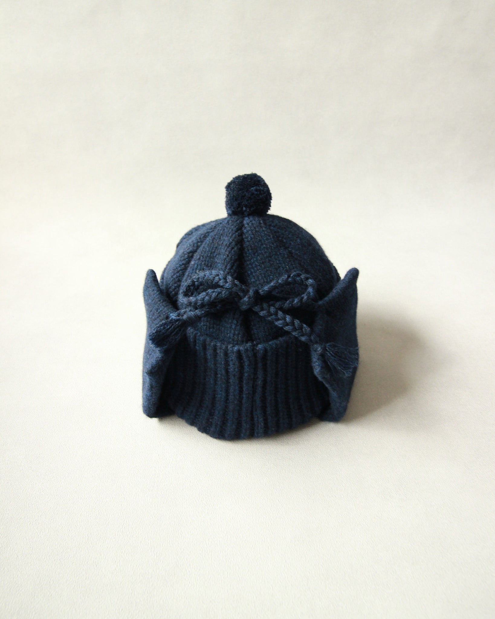 A pom-pom knit hat knitted from extra fine lambswool, which has a soft and fluffy texture.