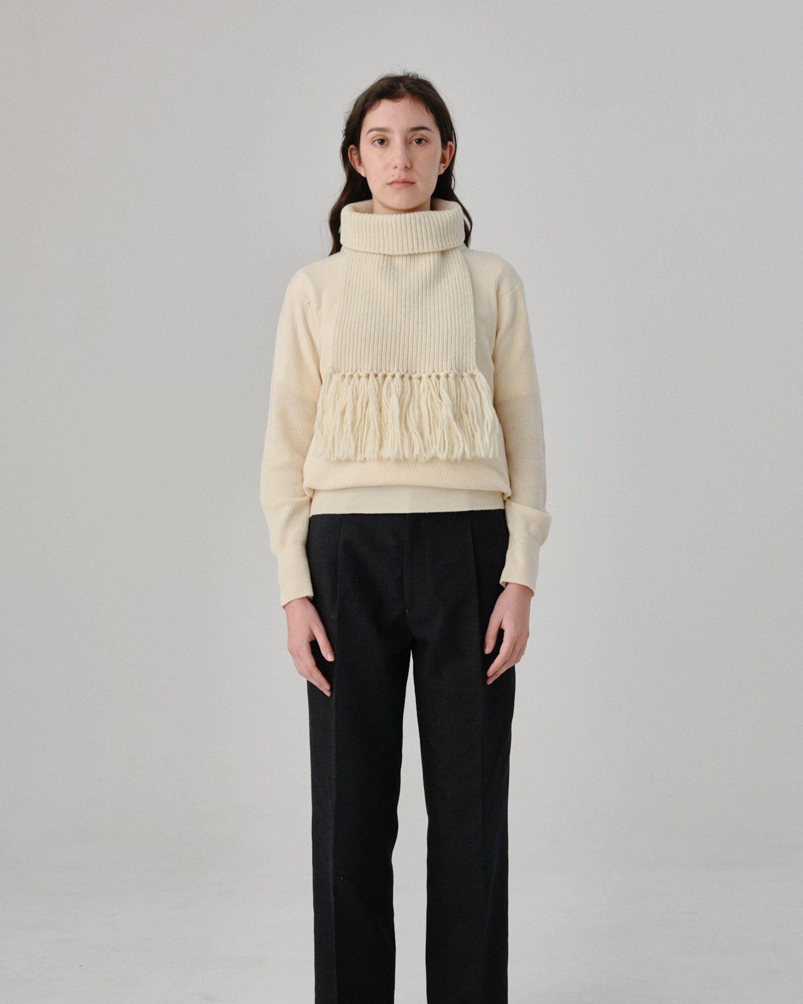 首元は三つ折りにすることですっきりとしたシルエットで着用出来ます。