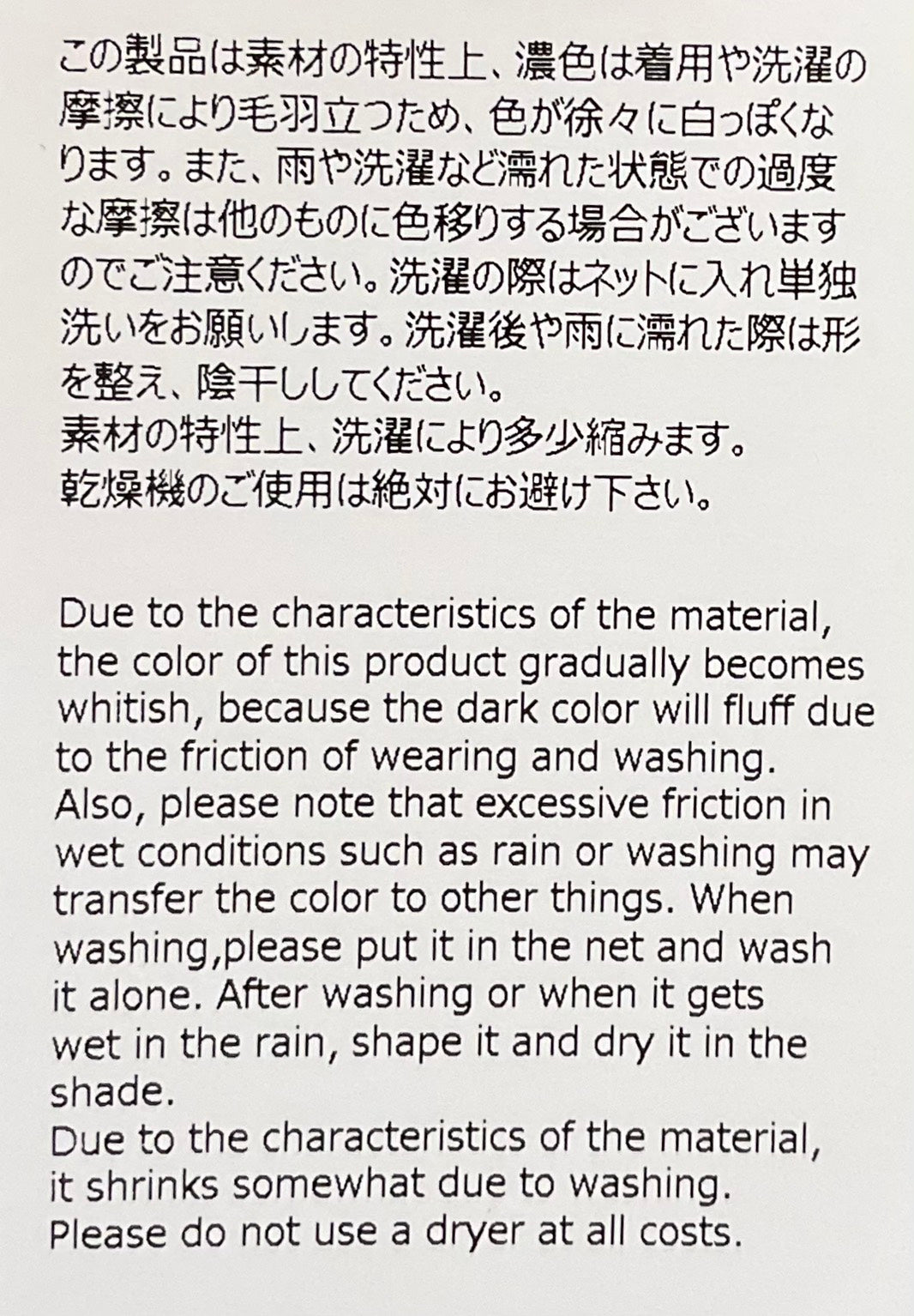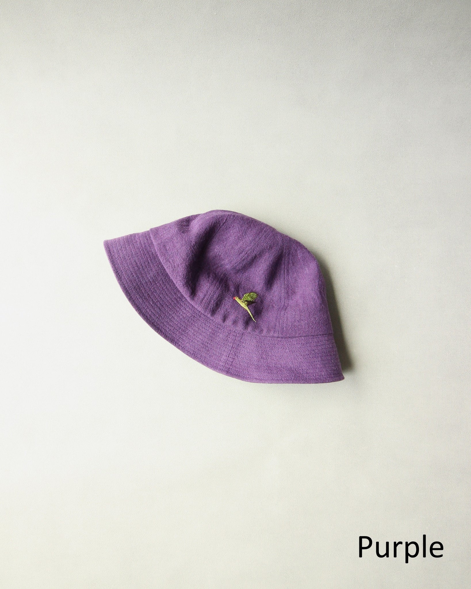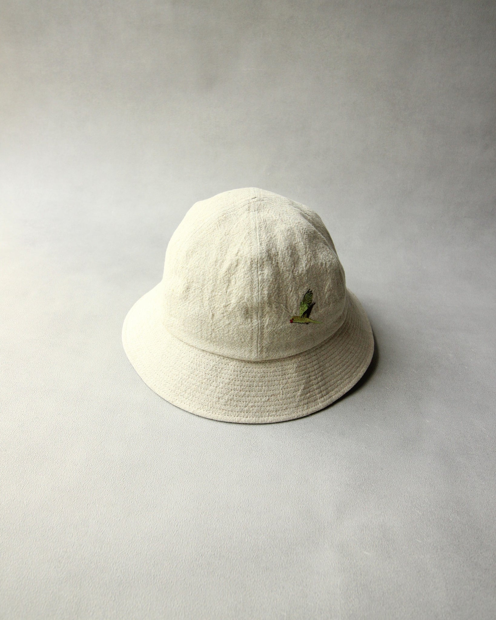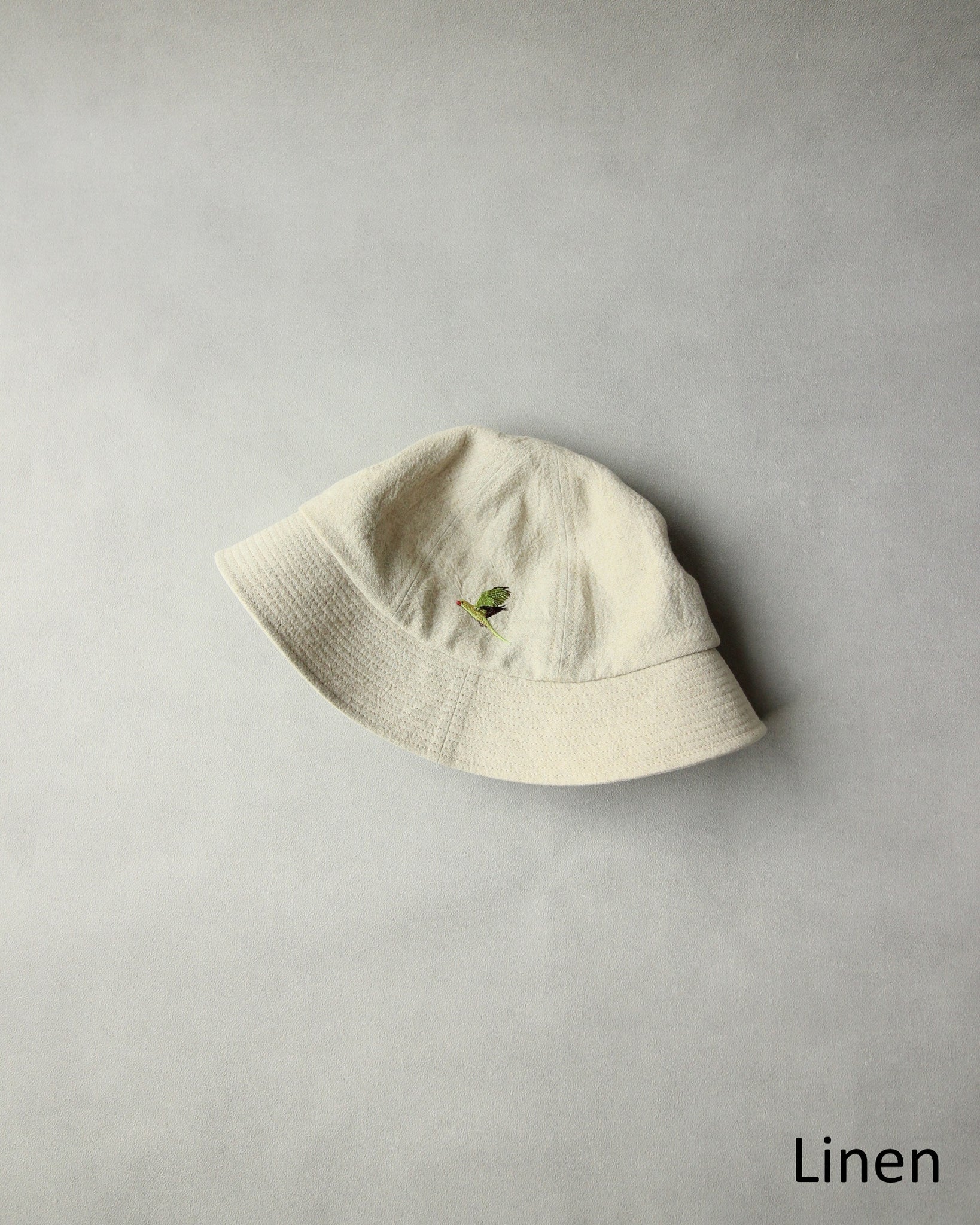 天然素材ならではの奥深い表情の生地とサイドにさり気なく刺繍したインコが力の抜けた絶妙なバランスです。
