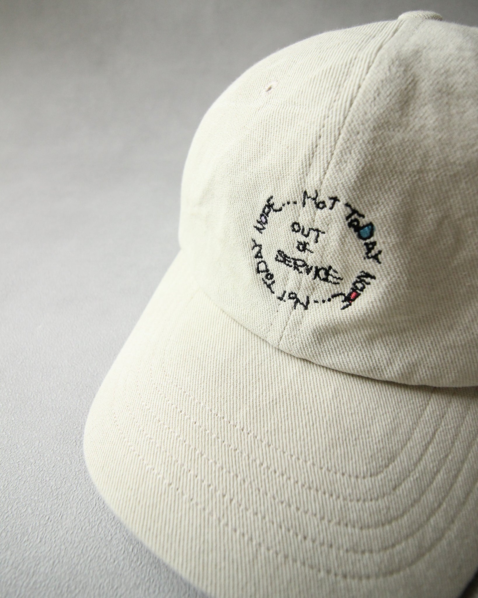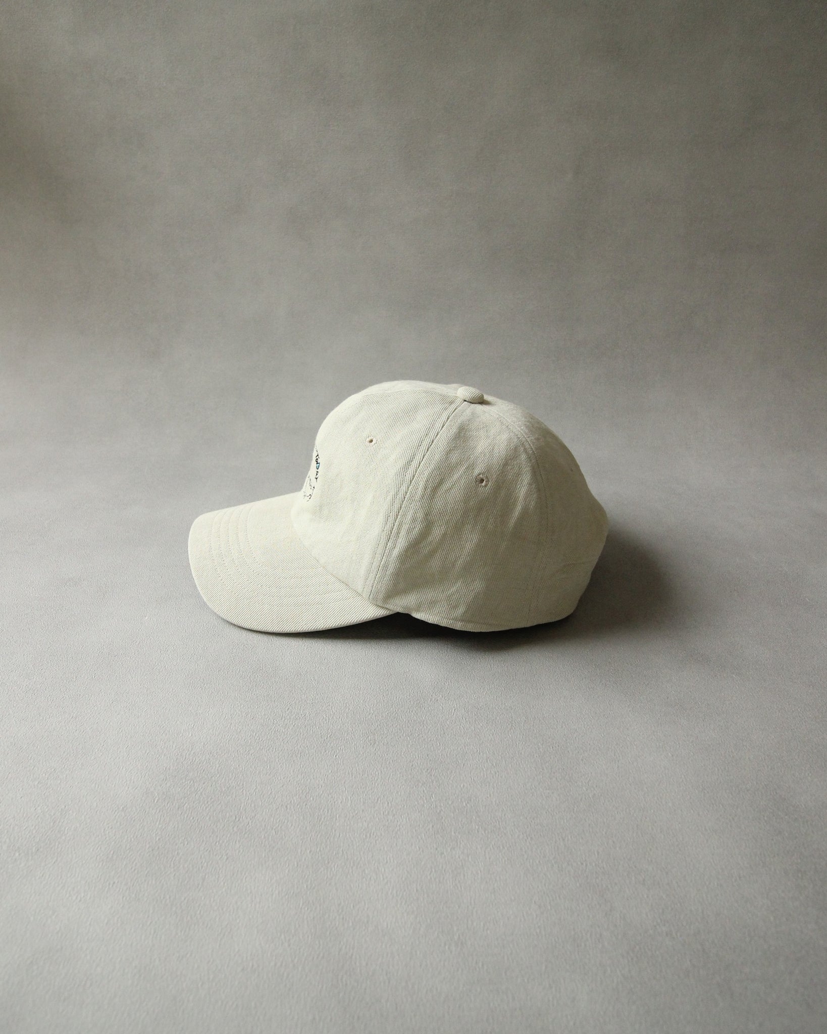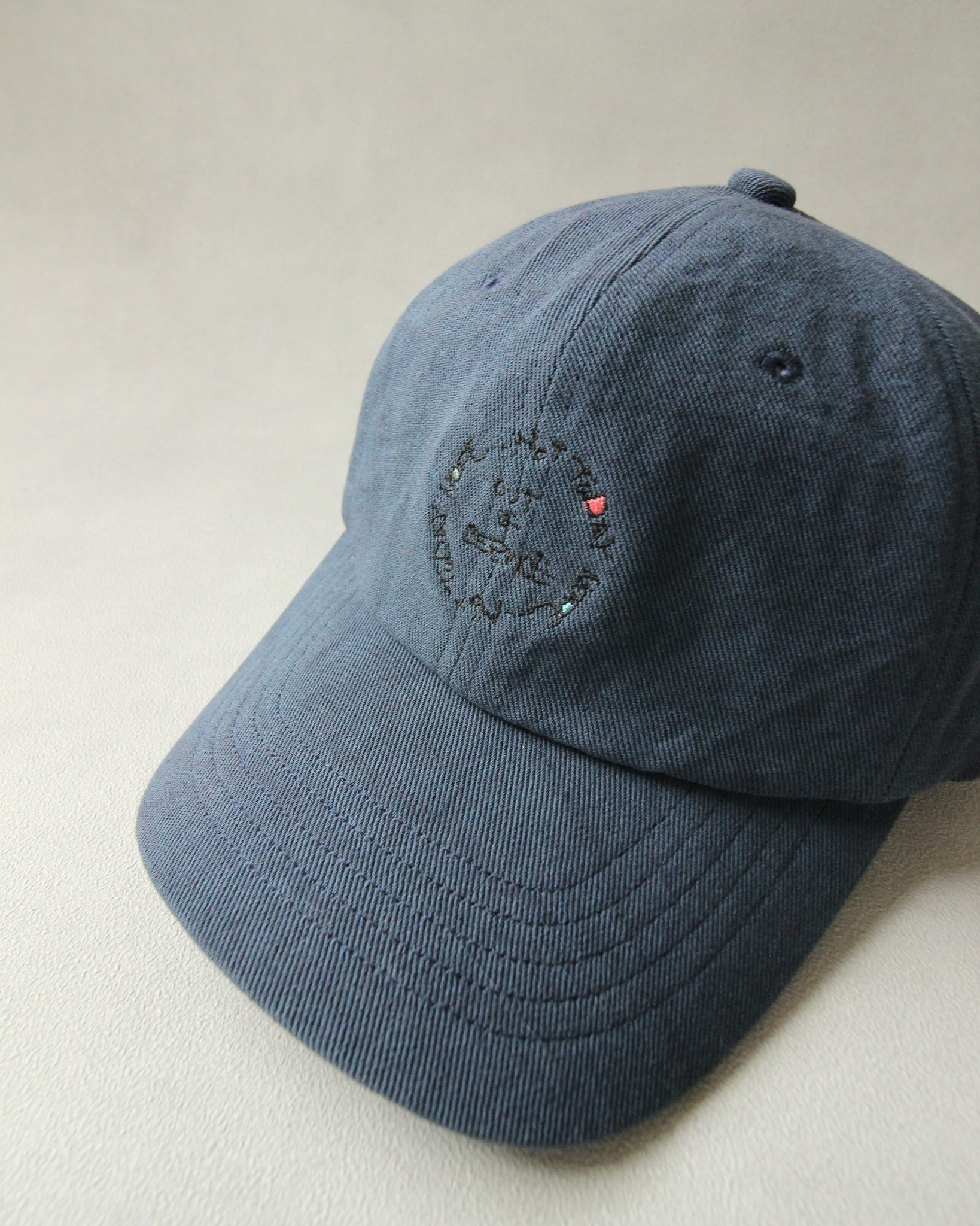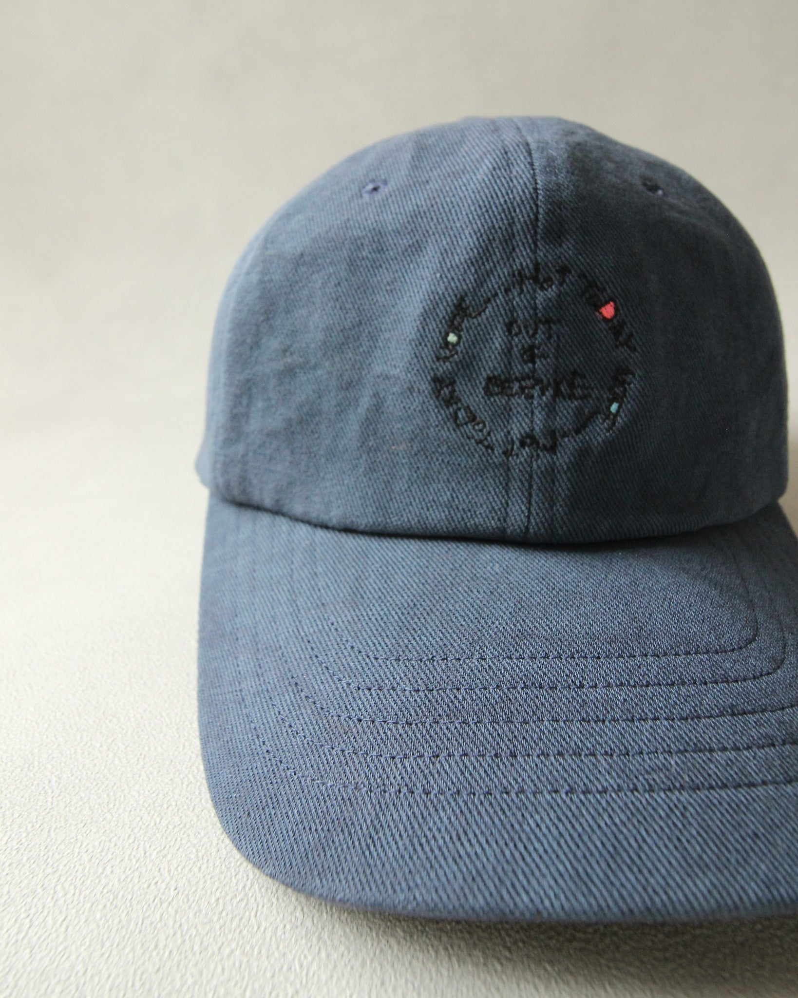 力の抜けた手書き刺繍を施したベースボールキャップ。