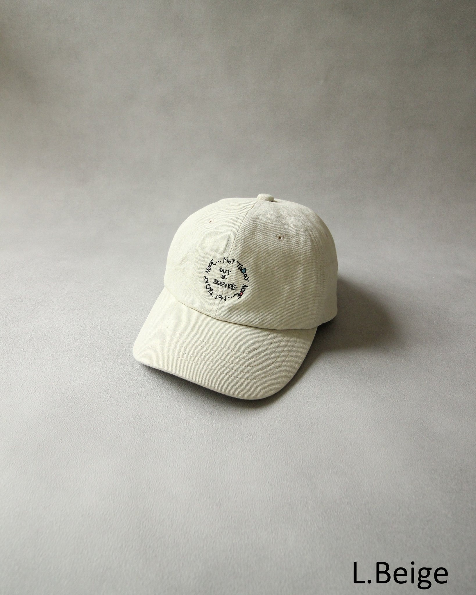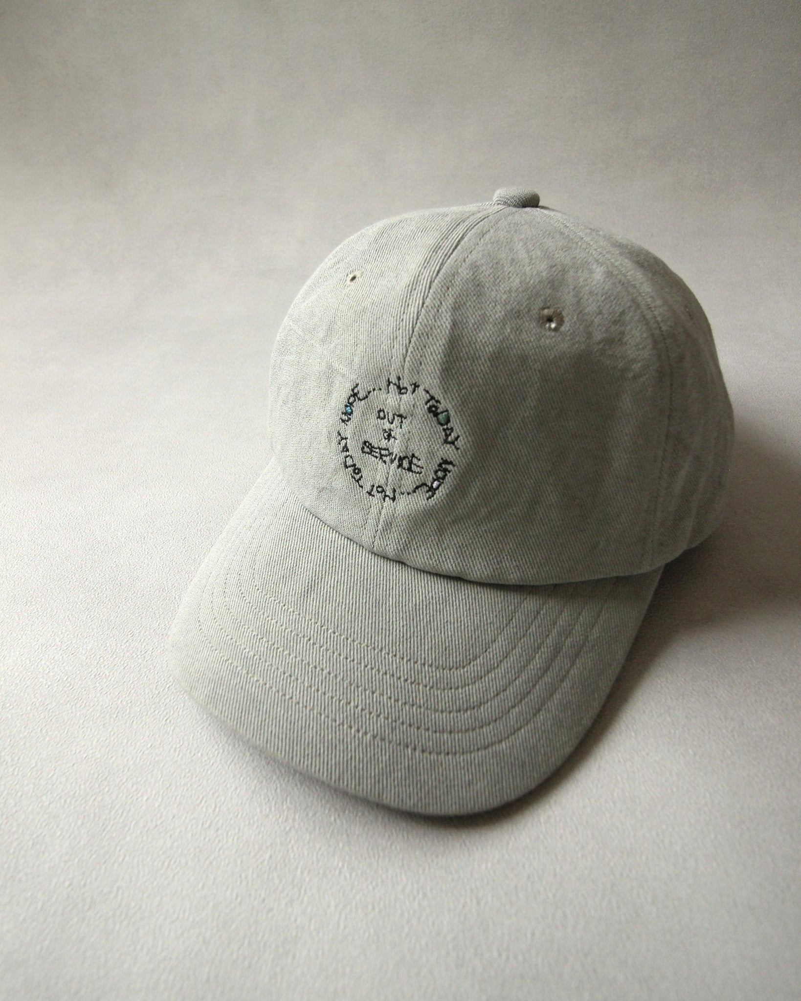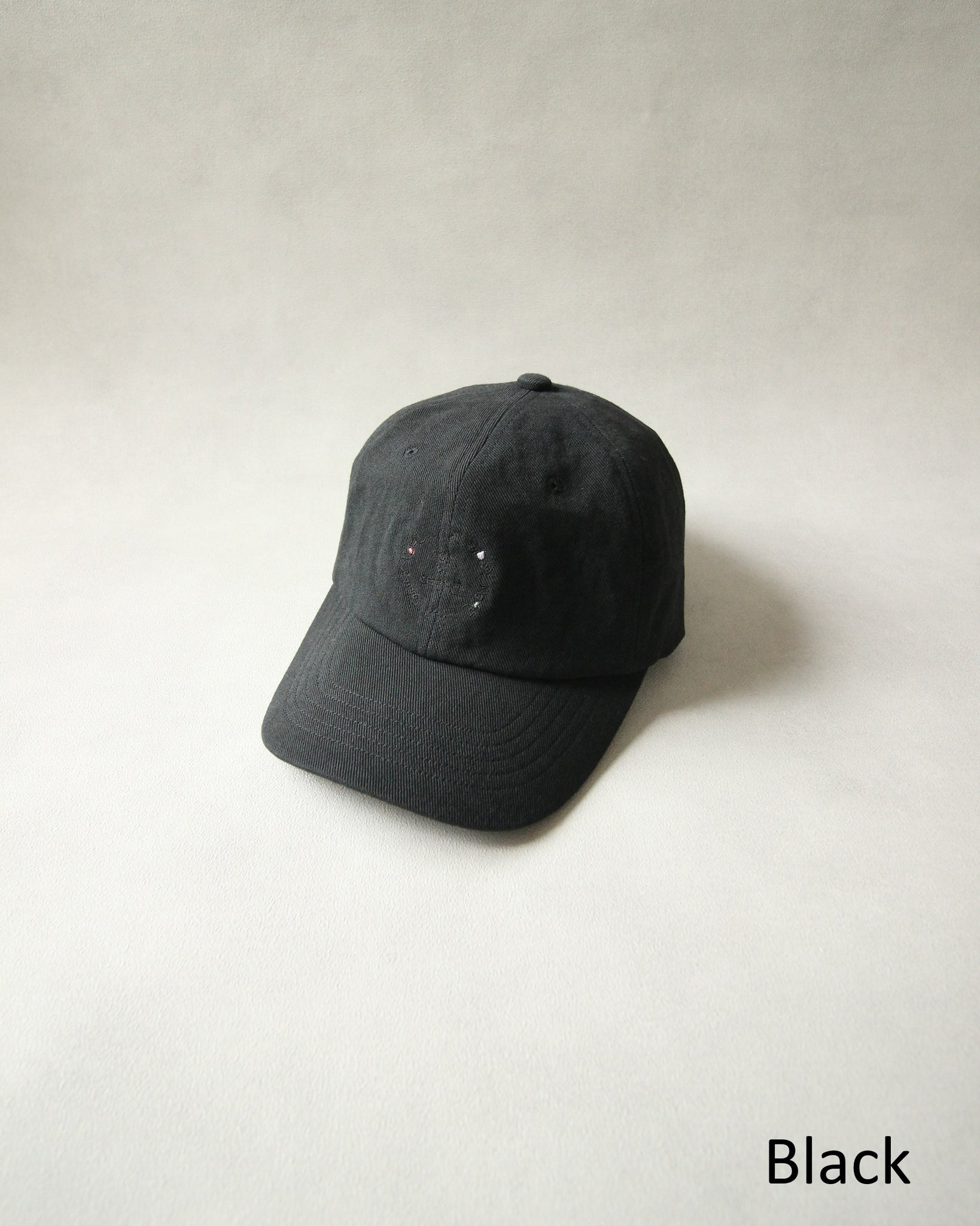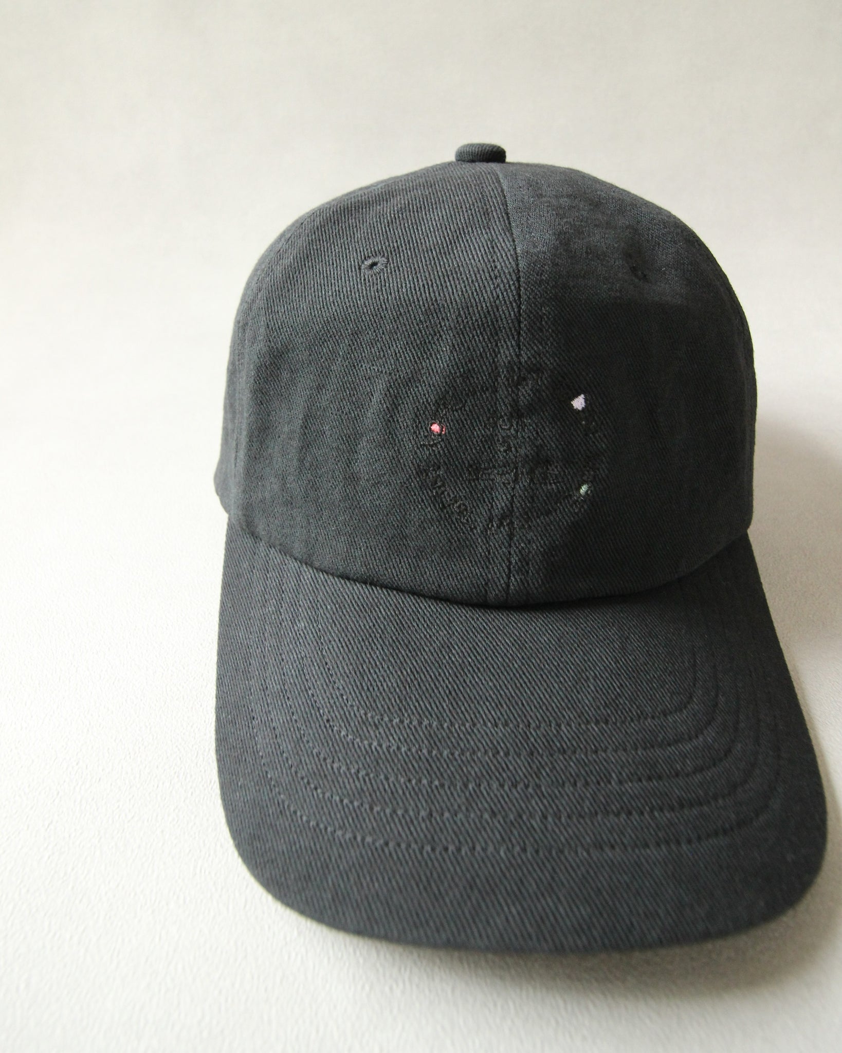 力の抜けた手書き刺繍を施したベースボールキャップ。