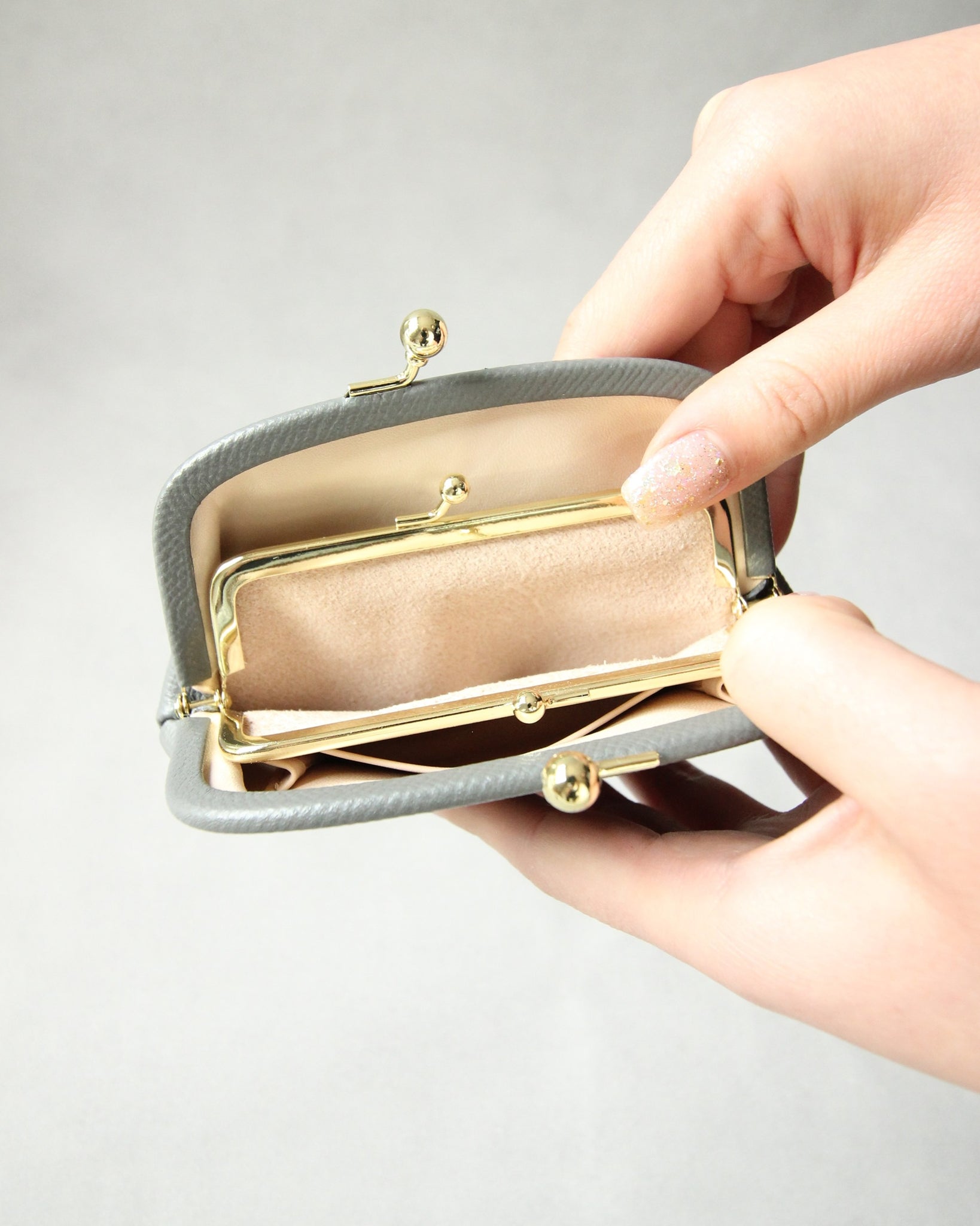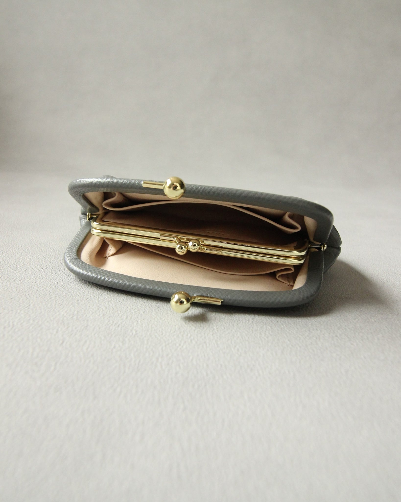 内側にある口金の中には鍵やカードなどを入れることも可能です。前後のエリアは、片方にはお札(2つ折り)とカードを、もう片方のエリアには小銭を収納することができます。