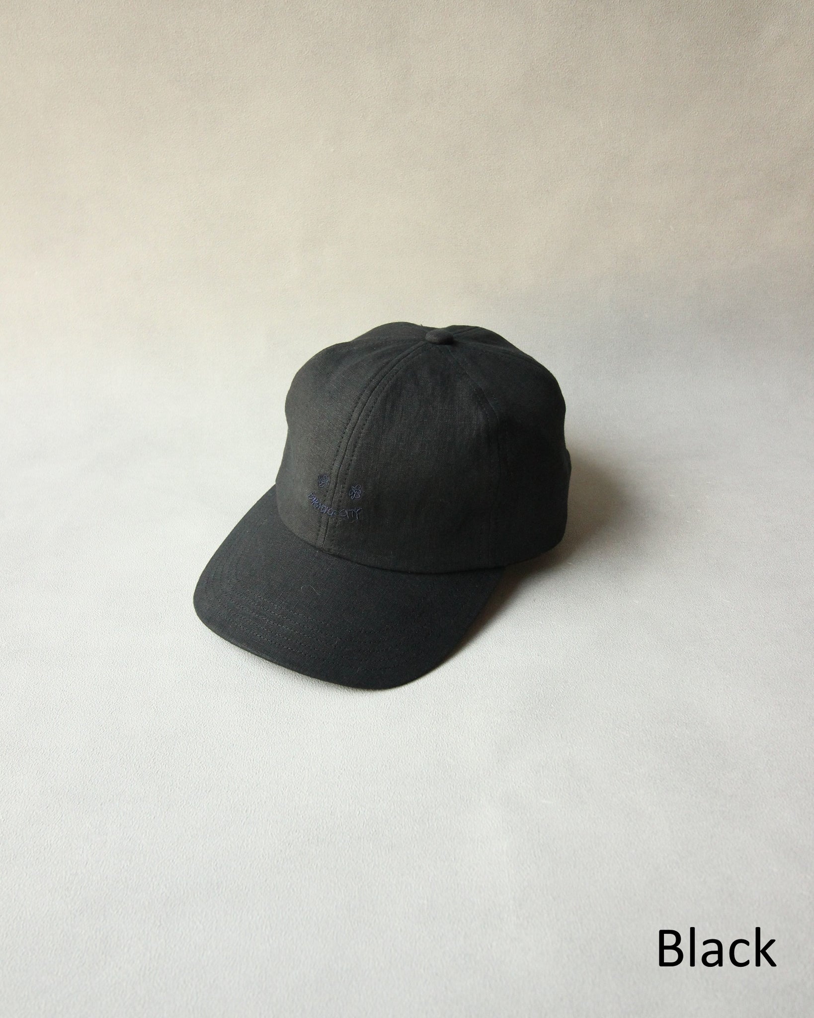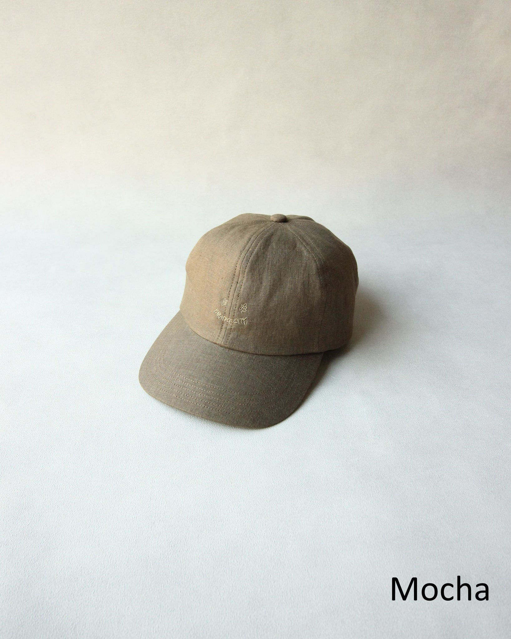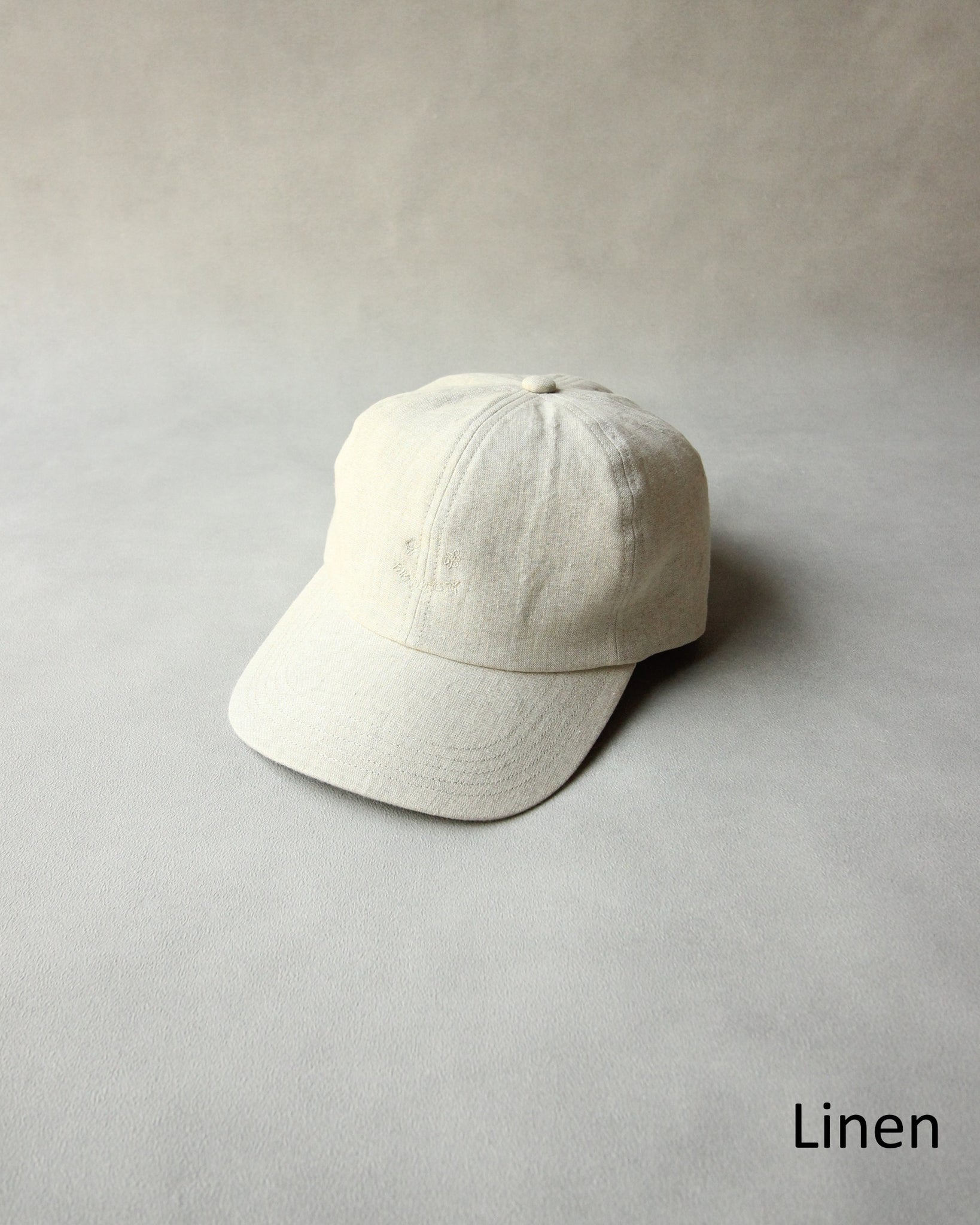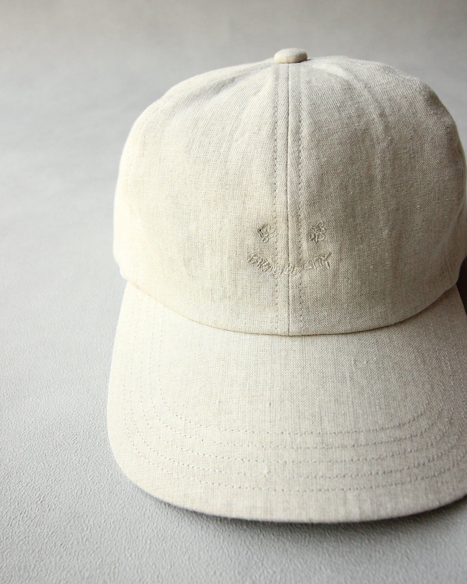キャッチーな刺繍を生地と同色の糸でさり気なく施したスマイリーキャップ。