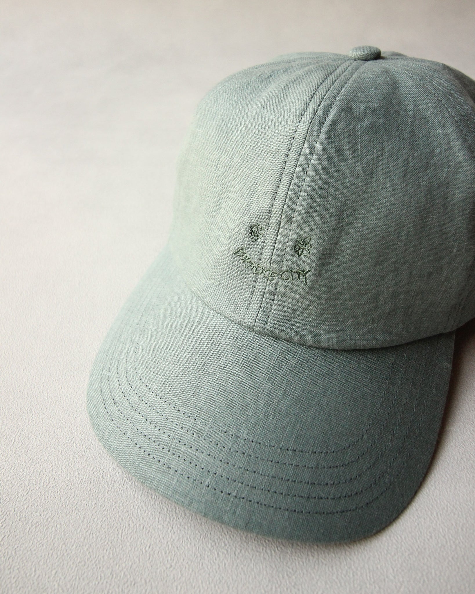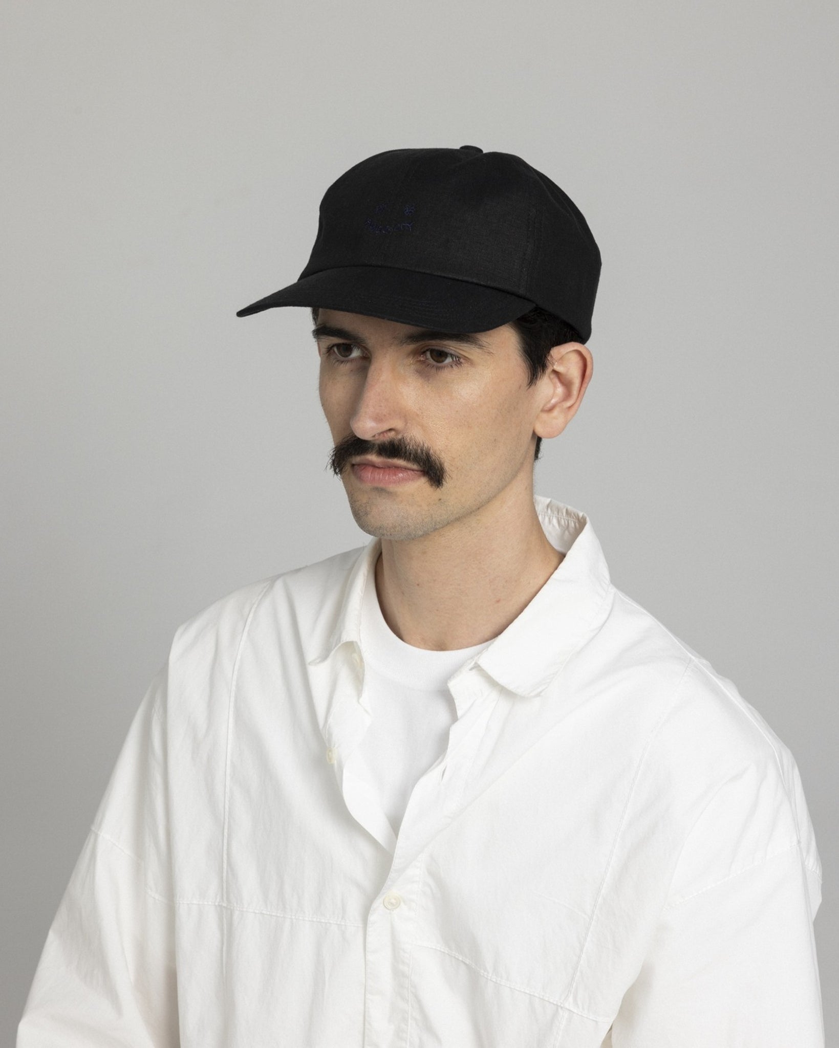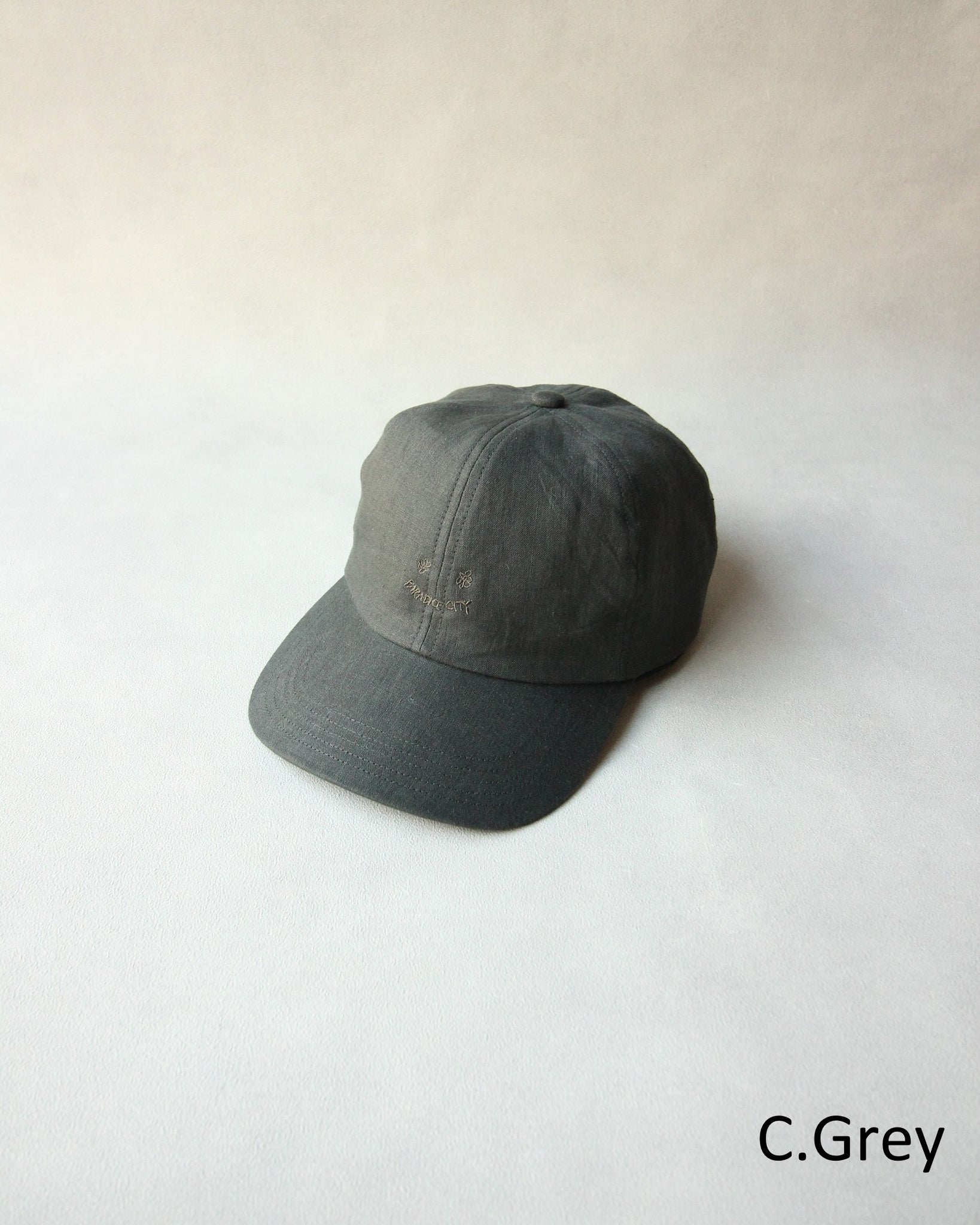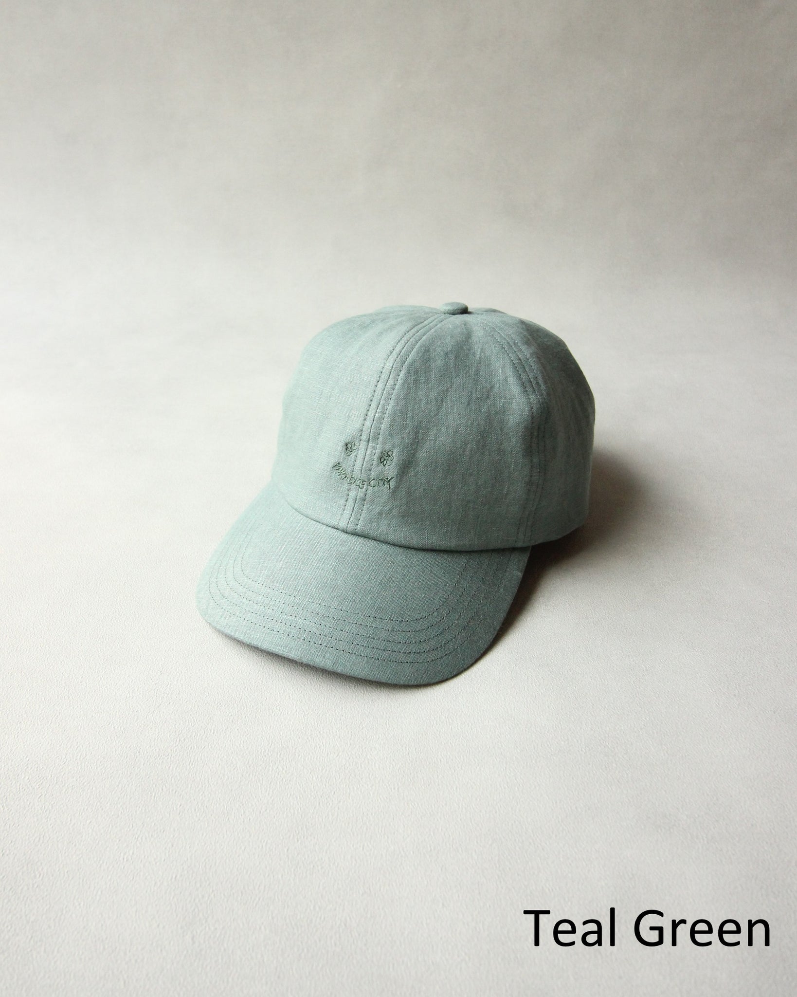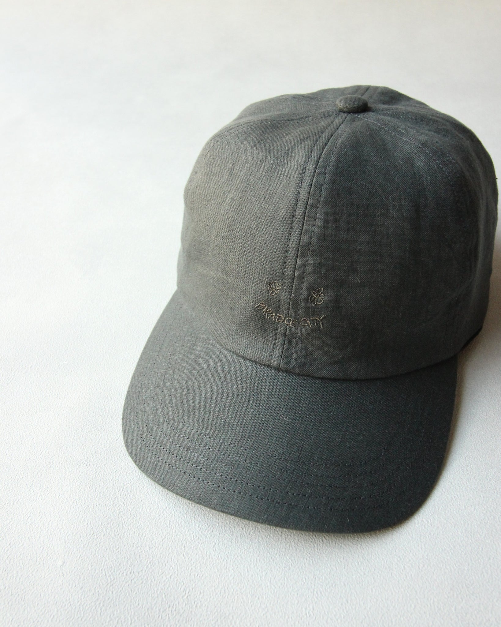 キャッチーな刺繍を生地と同色の糸でさり気なく施したスマイリーキャップ。